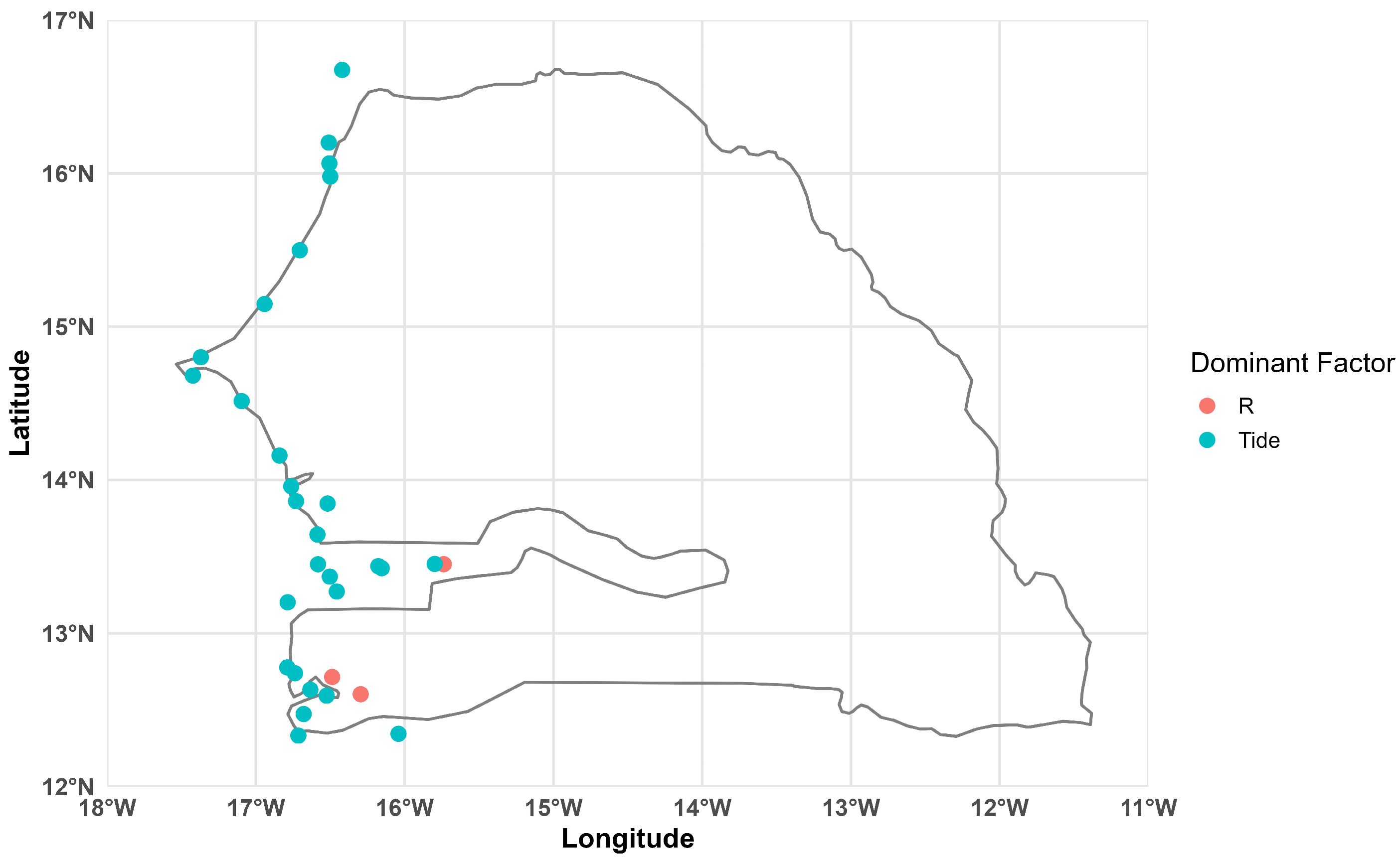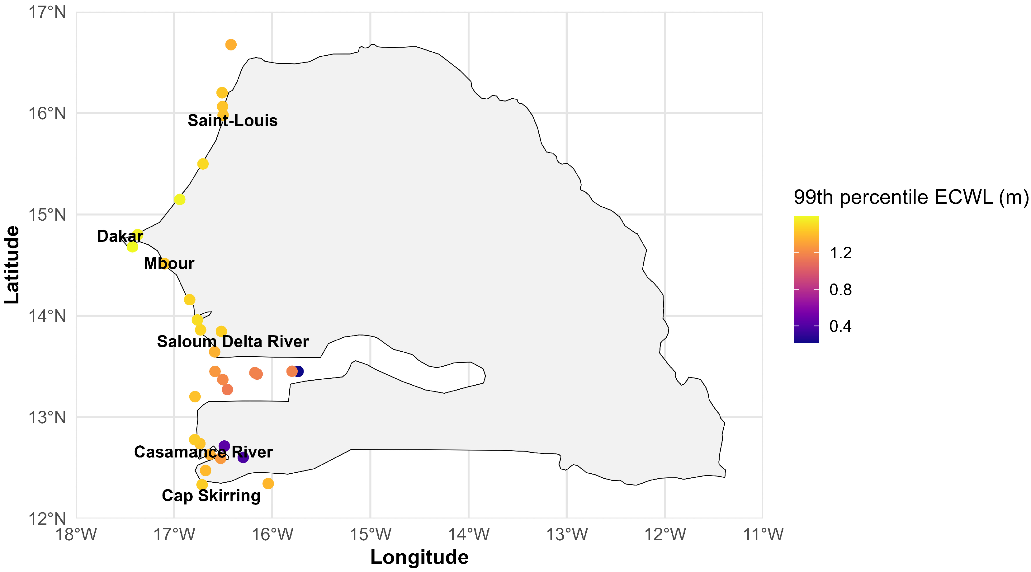 Cissé, C.O.T.; Almar, R.; Ndour, A. Spatial Analysis of Extreme Coastal Water Levels and Dominant Forcing Factors Along the Senegalese Coast. J. Mar. Sci. Eng. 2025, 13, 2342. https://doi.org/10.3390/jmse13122342