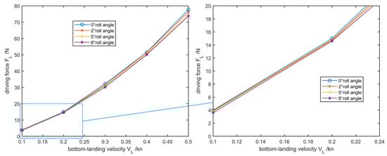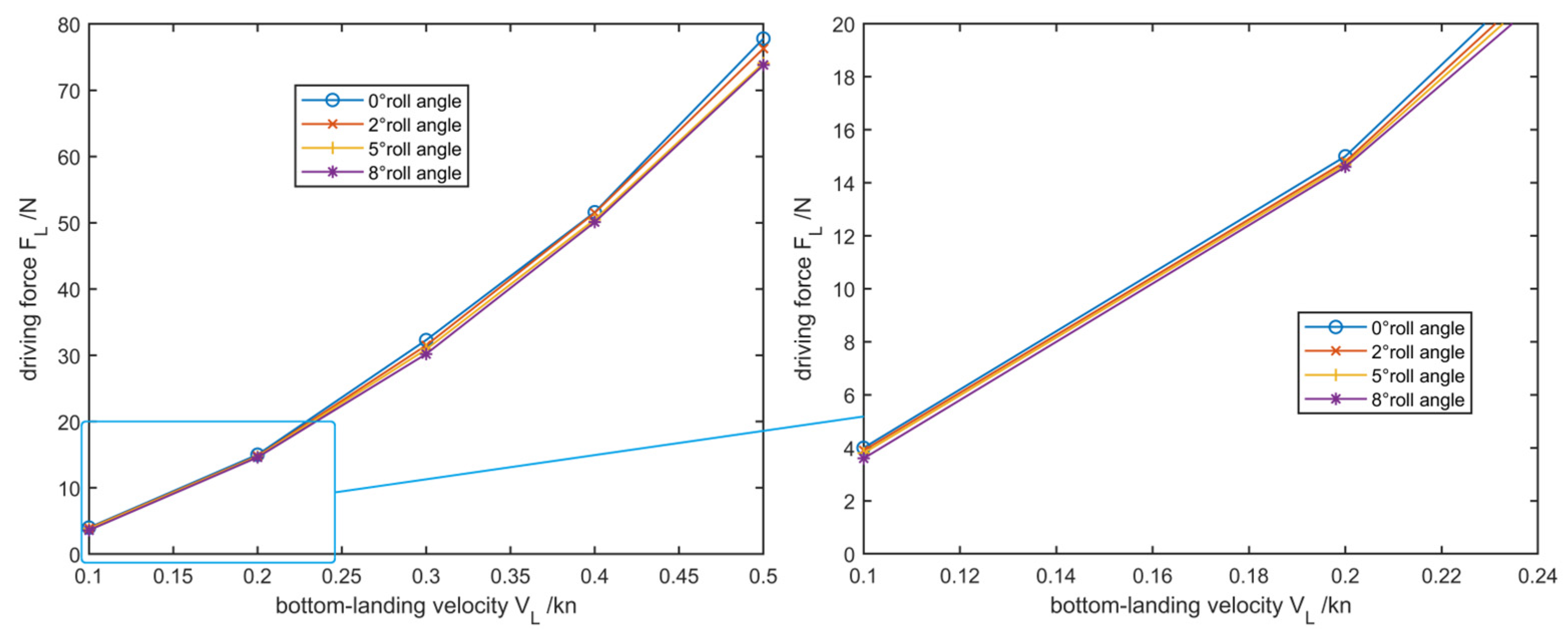 Analysis from the figure reveals that at the same velocity, the maximum driving force is required when both the roll angle and pitch angle are zero. Conversely, under the condition of the same driving force, the bottom-landing velocity is the smallest when both the roll angle and pitch angle are zero. For further analysis, as the roll angle increases, the flow-facing area of the bottom-landing plate decreases, leading to a slight reduction in driving force. Generally, the roll angle of an AUV can be eliminated through trimming, and it can usually be easily controlled within 0.5°, with its impact on the driving force being negligible. Comprehensive analysis indicates that the core of attitude control should focus on the optimization and regulation of the pitch angle.