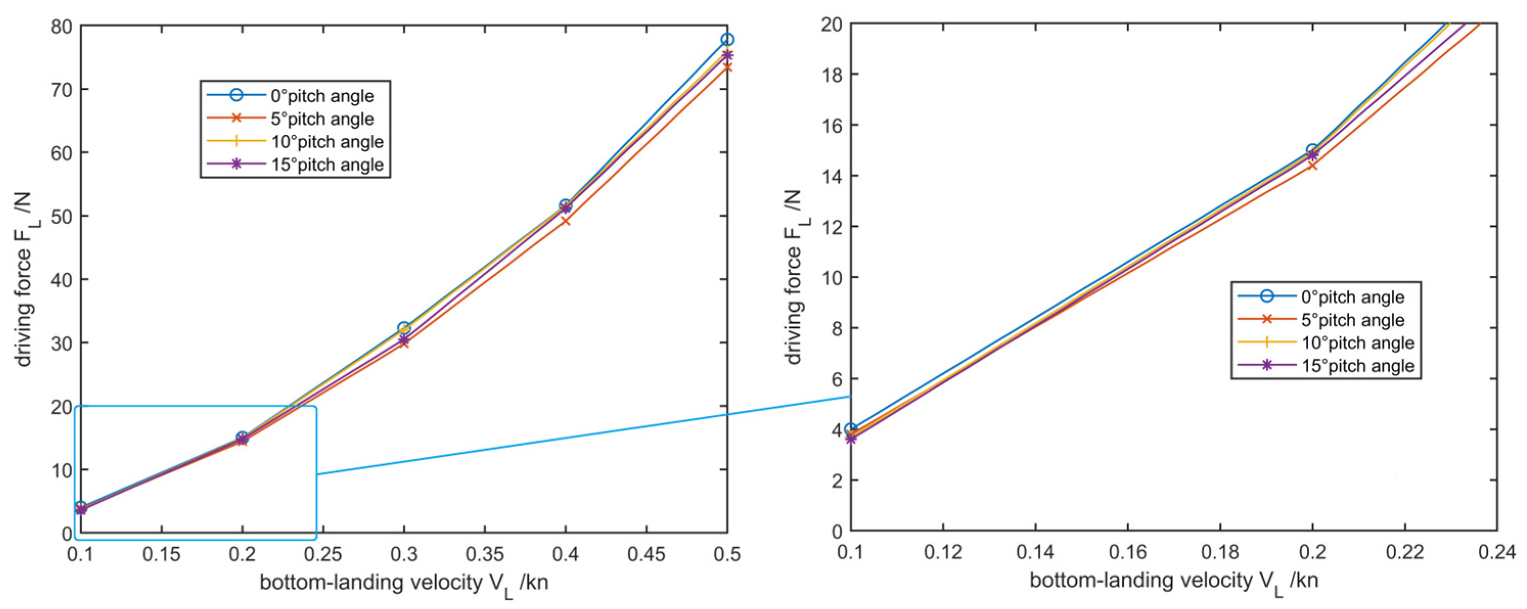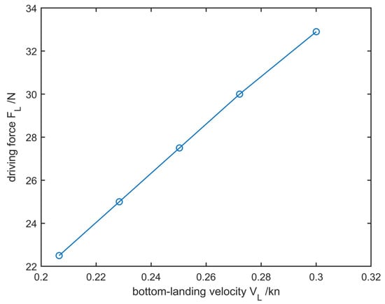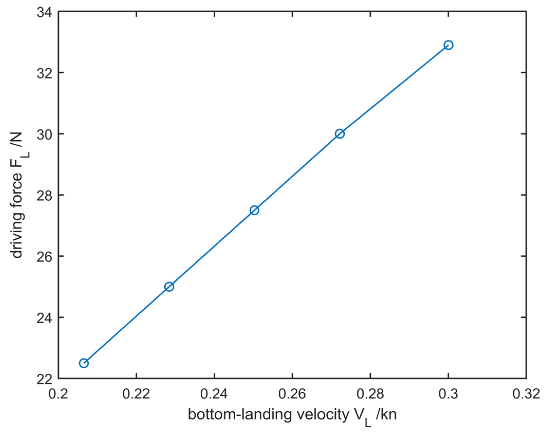 Figure 8). It can be seen from the figure that designing the driving force of the variable buoyancy adjustment mechanism to be 30 N can well meet the requirements of the bottom-landing driving force. Taking the seawater density as 1.021 Kg/m