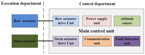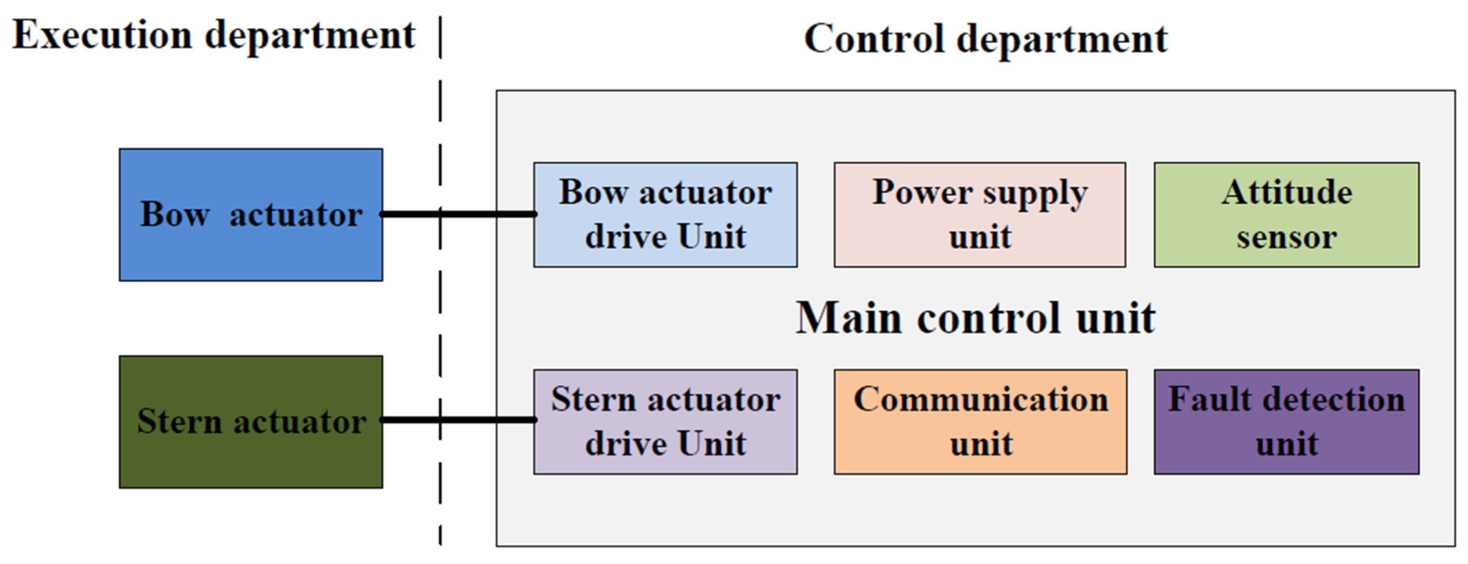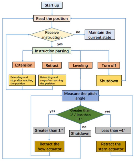 Figure 16). The main functions of the system include the control and detection of the bow and stern sets of executive mechanisms, as well as the sensing and adjustment of excessive pitch angles. When the seabed is uneven, the system can adjust the pitch attitude according to the attitude sensing data [