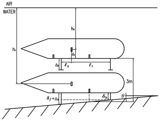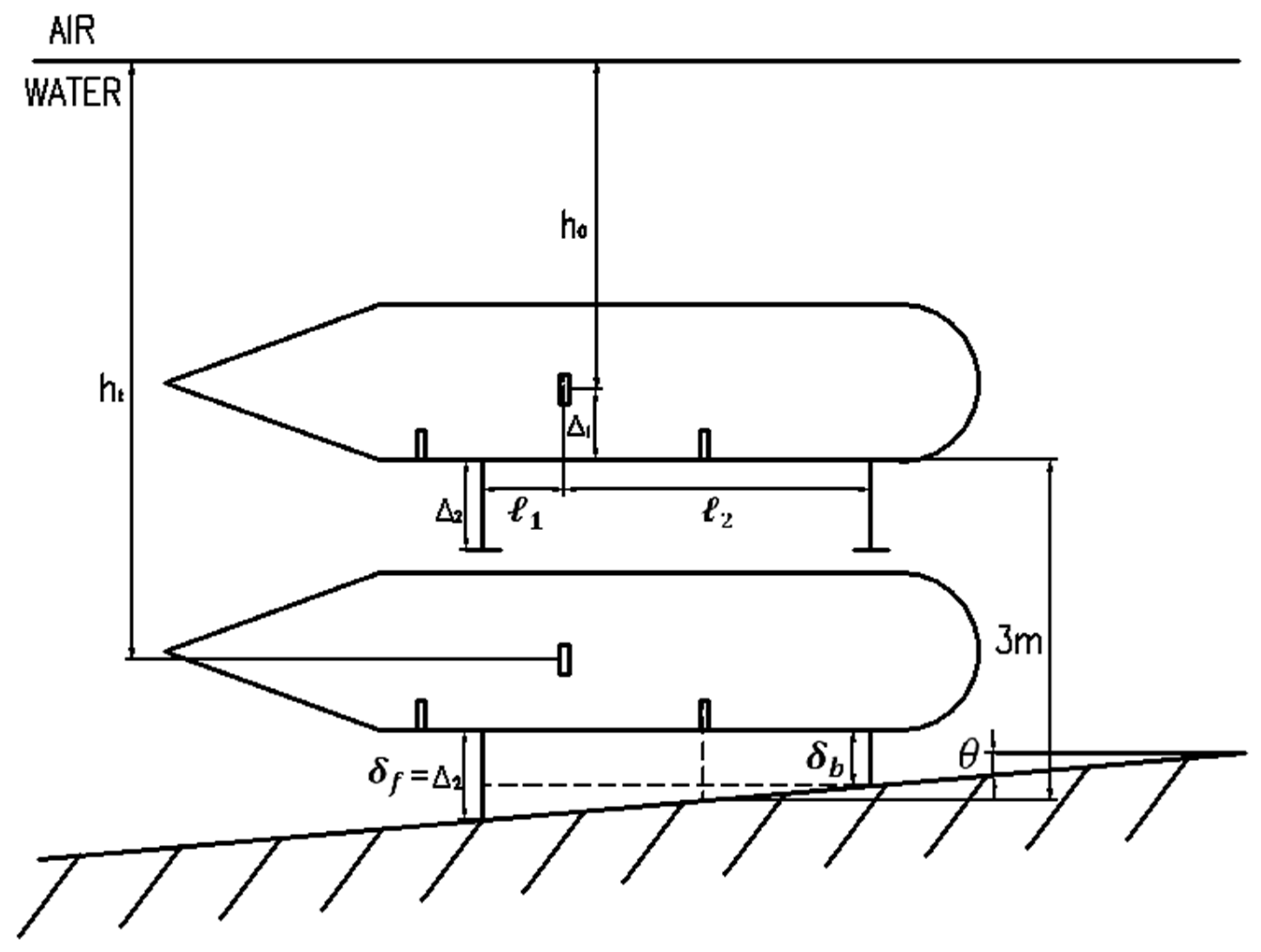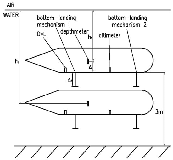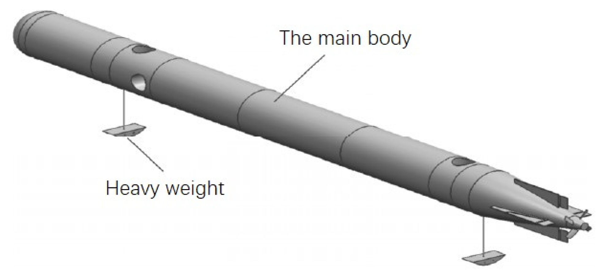 20]. The driving force for bottom-landing comes from the AUV’s negative buoyancy. Two weights are suspended at the bow and stern positions of the AUV’s bottom, as shown in the working schematic diagram (