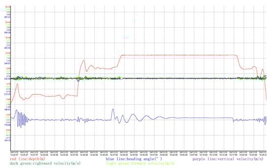 Bottom-landing control relies on vertical channel motors and buoyancy adjustment to control the AUV to land on the seabed with a certain heading, and then perform resident detection after adjusting the pitch attitude. For the bottom-landing control process, it is first necessary to manipulate the AUV to complete a hovering action at a fixed height of 3 m, then control the “biped” bottom-landing mechanism to extend the bottom-landing plate, turn on the buoyancy adjustment mechanism to recover buoyancy, make the AUV obtain negative buoyancy, and drive the AUV to land on the seabed. As the height from the seabed becomes smaller and smaller during bottom-landing, the altimeter and Doppler will enter the blind zone. Therefore, it is necessary to use the change in depth value as the criterion for judging whether the bottom-landing is completed. The target value is determined by subtracting the extended length of the bottom-landing mechanism and the installation height of the altimeter from the current water depth value [