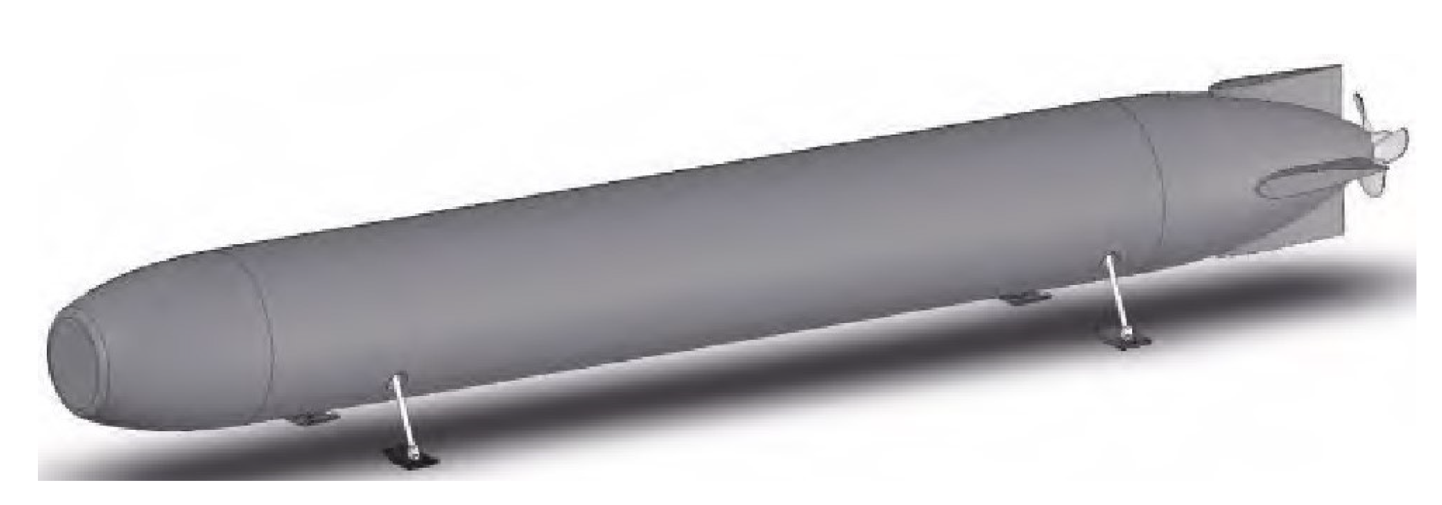 Z is 429 MN/m. The preliminary bottom-landing design scheme of the AUV is specifically shown in the figure below. It adopts two bow- and stern- supporting legs to achieve bottom-landing. As shown in the preliminary design scheme (