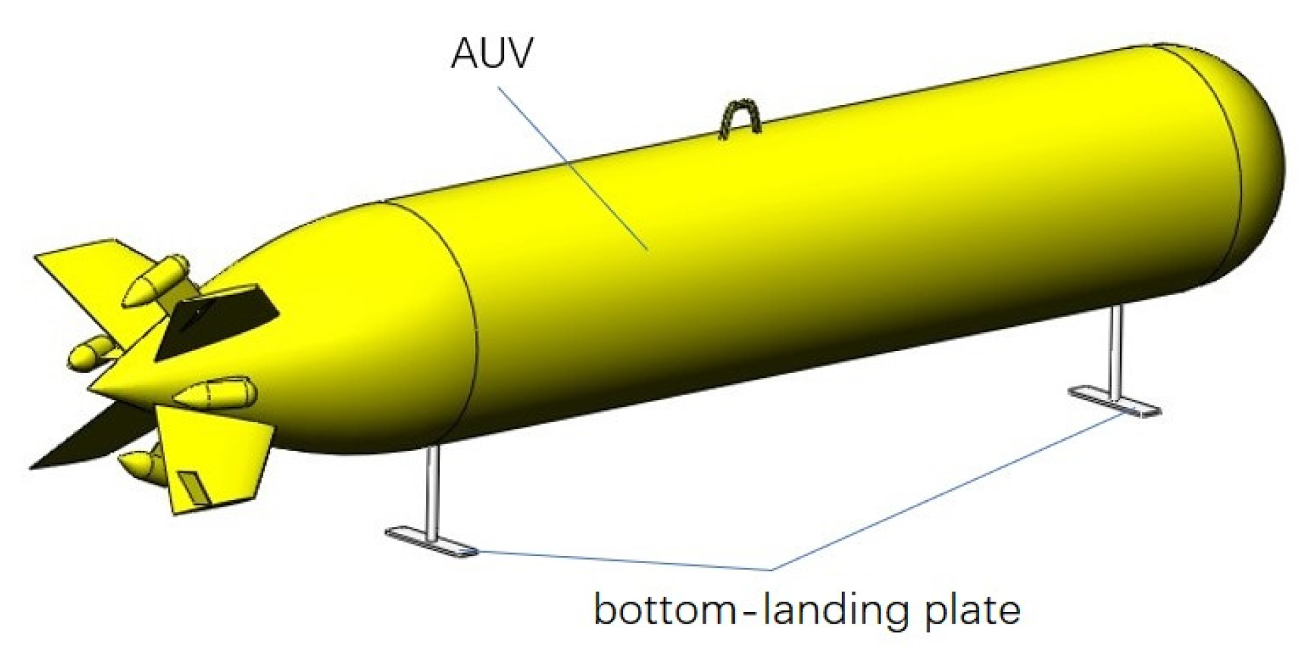 12]. For bottom-landing, this AUV uses rigid fixed brackets installed at its bottom for support. It is configured with slight negative buoyancy and paired with vertical duct thrusters to achieve bottom-landing and bottom-leaving operations. During bottom-landing, the AUV’s bottom-mounted brackets contact the seabed, protecting the bottom-mounted detection equipment from damage and minimizing safety risks. The system is simple and reliable but is of a relatively large size.