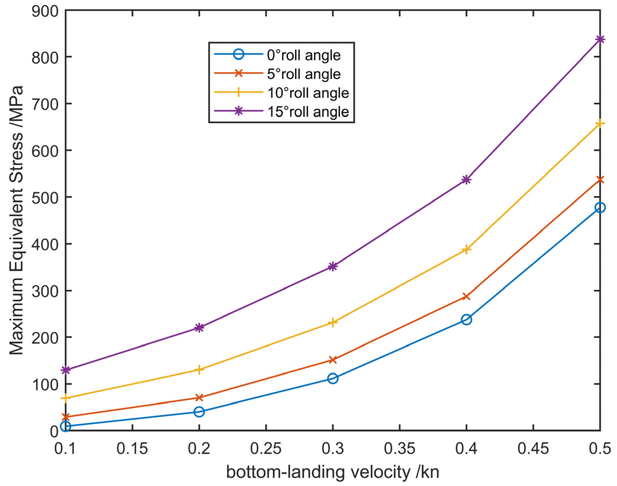 It can be observed from the figure that as the vertical velocity (velocity is proportional to the driving force) increases, the maximum equivalent stress of the bottom-landing impact increases. With the increase in the AUV’s pitch angle, the maximum equivalent stress of the bottom-landing impact increases significantly. Therefore, it is necessary to control the bottom-landing velocity and bottom-landing pitch angle; otherwise, when the AUV lands on a rigid substratum, it is likely to cause damage to the bottom-landing mechanism.