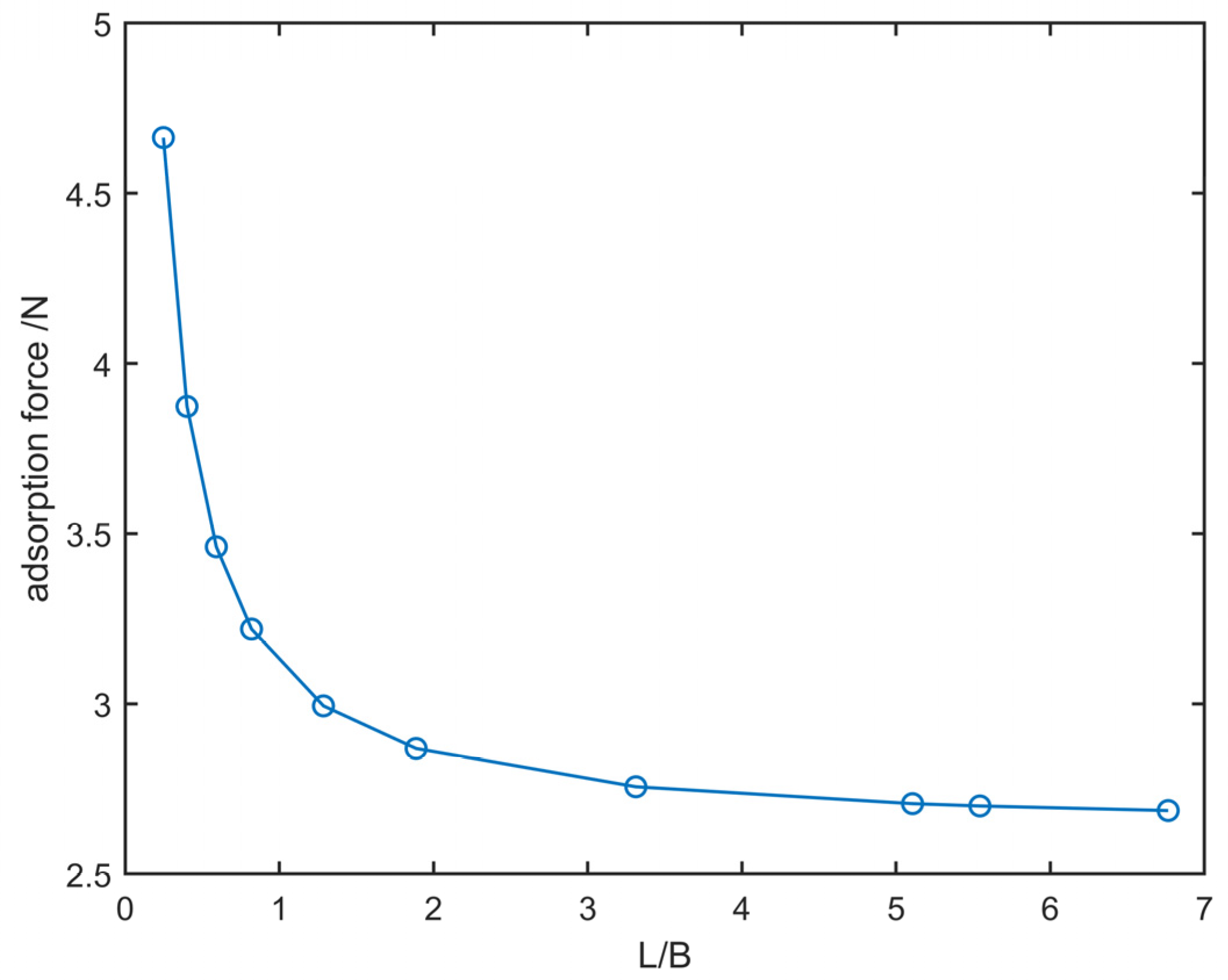 = 5 mm, and the variation relationship of the adsorption force under different length–width ratios of the bottom-landing plate is studied. The area of the bottom-landing plate is constrained to 101,086 mm