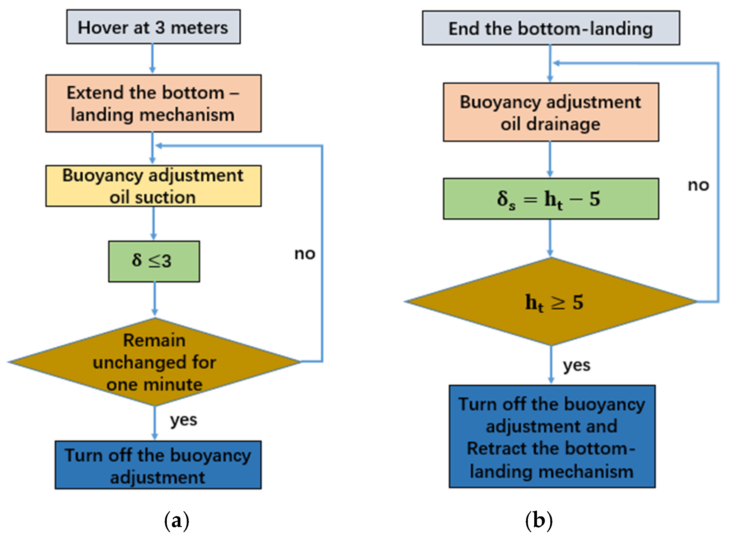 Bottom-leaving control relies on buoyancy adjustment by draining oil to control the AUV to leave the seabed, enabling the AUV to surface to a navigable state through static driving. As specifically shown in the bottom-landing and -leaving control process (