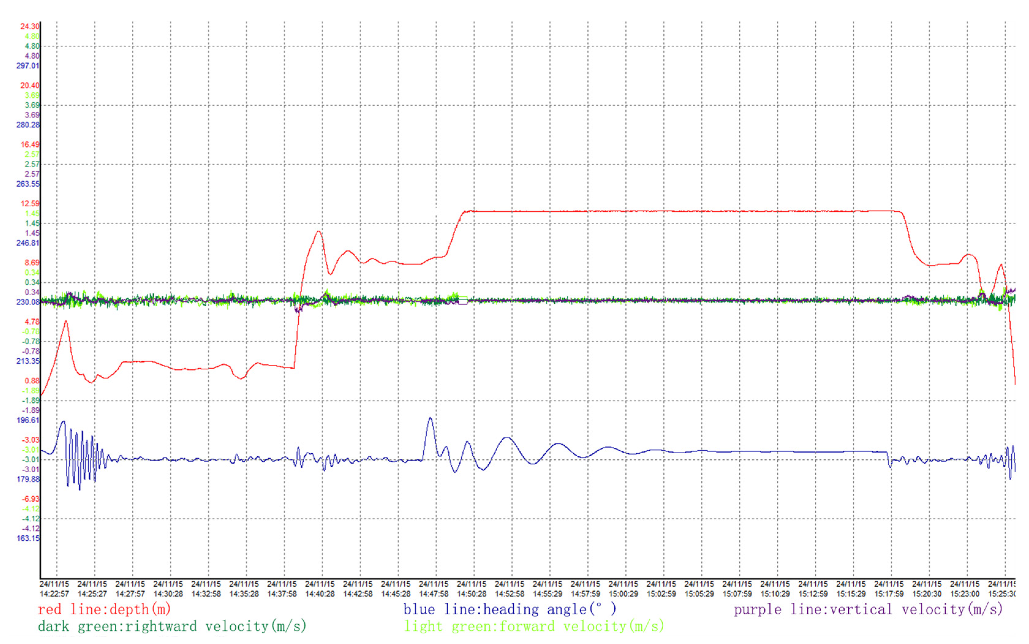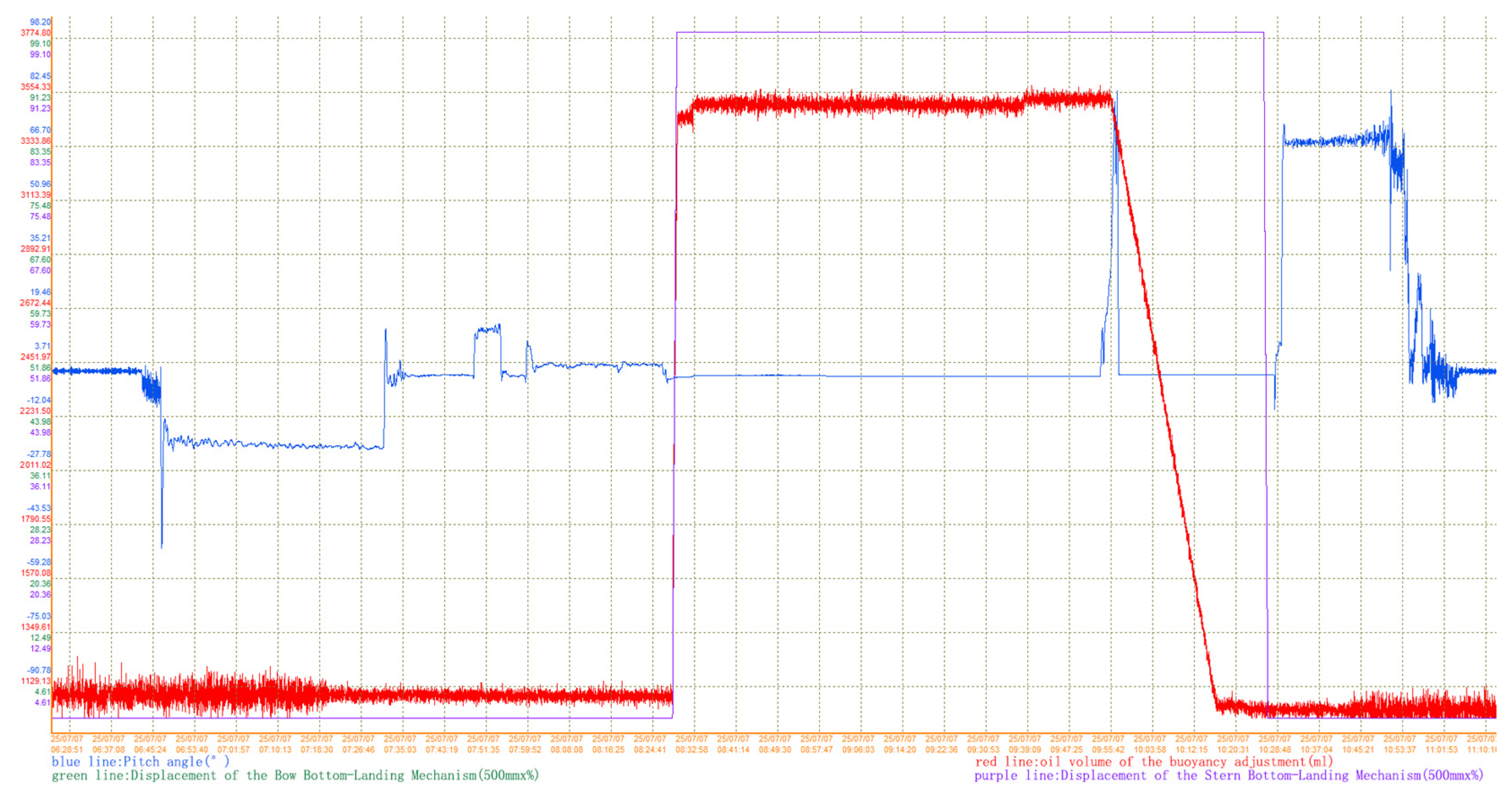 When the AUV meets the above criteria, the DVL and altimeter will normally obtain the height data relative to the seabed. At this point, it is considered that the bottom-leaving operation is completed; the buoyancy adjustment should be turned off, the bottom-landing mechanism retracted, and the bottom-leaving command exited. The AUV can then carry out subsequent exploration tasks.