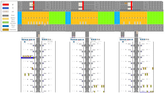 - Based on a simulation platform, a U-shaped ACTs simulation model with a standardized layout and complete operational logic is constructed. In the simulation model, the accuracy of the operation process of AGVs and YCs is mainly considered. For this reason, a refined road network structure for the horizontal transportation area is built, real operational logics such as AGVs charging and parking waiting in buffer zones are implemented, and a refined control logic for YCs single-step actions is designed—all to ensure high-precision reproduction of equipment operations by the simulation model. The high-precision nature of this simulation model provides a reliable data foundation for the subsequent iterative optimization of the multi-objective simulation optimization algorithm.