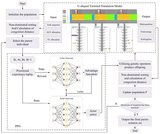 - Considering the complexity of the multi-objective optimization for AGVs and YCs collaborative scheduling, a hybrid initialization strategy integrating Logistic chaotic mapping and Latin Hypercube Sampling (LHS) is proposed. To enhance the search capability and efficiency of the algorithm, a dynamic genetic operator selection strategy is proposed using the learning mechanism of PPO, which is used to select appropriate genetic operators from different candidate operators; a prioritized experience replay mechanism and an ε-greedy (Epsilon-greedy) strategy are also introduced. Finally, in accordance with the characteristics of multi-objective problems, a preference-based hybrid weighted Technique for Order Preference by Similarity to Ideal Solution (TOPSIS) is designed to select the optimal solution from the Pareto solution set, thereby enabling more accurate and preference-oriented multi-objective decision-making.