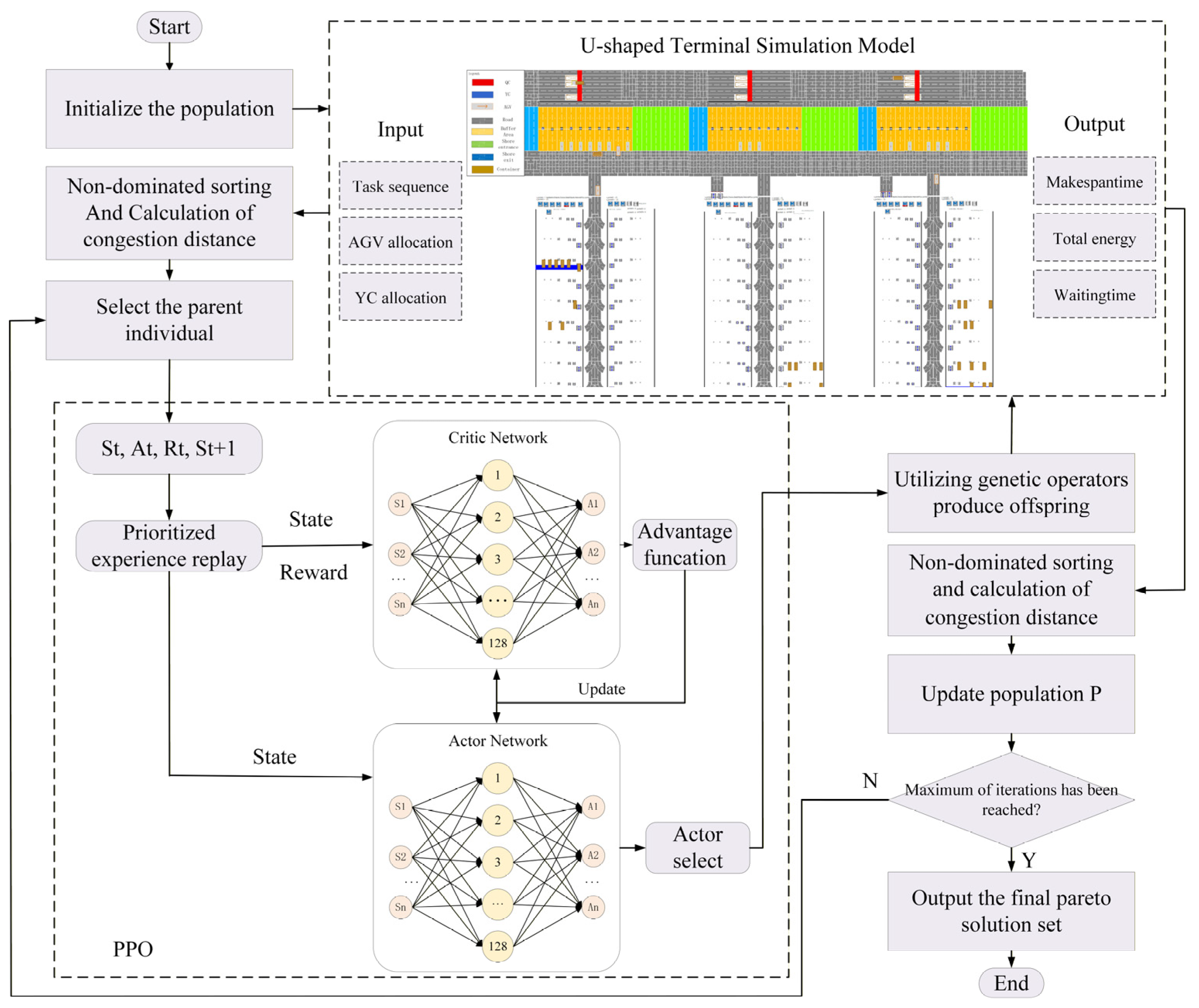- Aiming at the multi-objective optimization problem of AGVs and YCs collaborative scheduling in U-shaped ACTs, this paper utilizes the powerful learning ability of the Proximal Policy Optimization (PPO) algorithm and the multi-objective optimization ability of the Non-dominated Sorting Genetic Algorithm II (NSGA-II), combined with a high-precision simulation model, and for the first time proposes an improved NSGAII multi-objective simulation optimization method based on PPO (INSGAII-PPO). This method uses the simulation model to perform real-time full-process simulation of the scheduling schemes generated by the multi-objective optimization algorithm, and feeds back high-fidelity data to the algorithm for iterative optimization. This ensures that the final solutions obtained are more in line with practical requirements and provide a guiding basis for real-world decision-making.