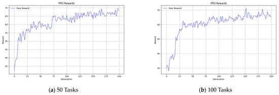 For each comparative algorithm in the experiment, the corresponding parameter settings are as follows: Iteration count: 200, Population size: 30, Maximum simulation evaluations: 24,000, Sliding reward window size: 50, Experience replay pool size: 500, Policy network learning rate: 5 × 10−5, Value network learning rate: 1 × 10−4, Clipping factor: 0.1, Training sample batch size: 128. All experiments were conducted on a computer equipped with an Intel Corei7-13700 CPU @2.10 GHz processor and 32 GB RAM. The algorithms were implemented in Python 3.11. The reward curves for model training across different task scales are shown in Figure 6.