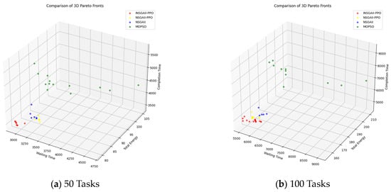 To visualize the Pareto frontiers obtained by different algorithms, the distribution of Pareto frontier solutions in three-dimensional space was selected from four instances of varying task scales, as shown in Figure 9. It can be observed that the MOPSO algorithm generally yields a larger number of Pareto frontier solutions, but these solutions exhibit the highest objective values and an uneven distribution. In contrast, the INSGAII-PPO algorithm typically produces Pareto frontier solutions with the lowest objective values and a more uniform distribution compared with the comparison algorithms. This indicates that this method demonstrates superior performance in solving the multi-objective cooperative scheduling problem for AGVs and YCs.