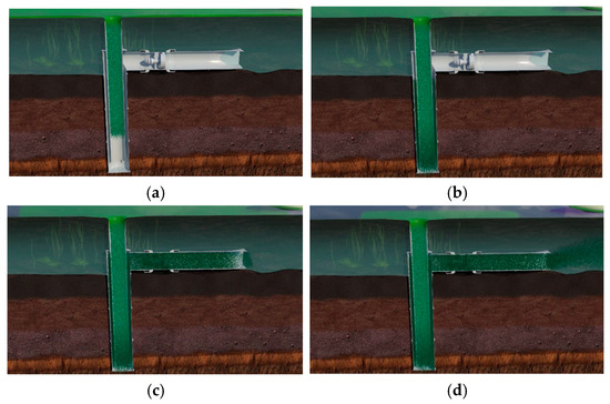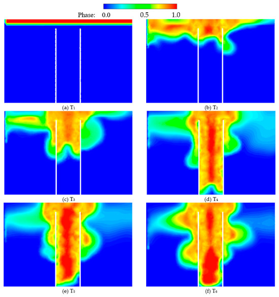 A numerical simulation was conducted on the process of blue algae being drawn into the vortex well of the algae extraction device, and six key moments (T1–T6) were selected for elaboration and explanation. Figure 11 shows the phase change process of cyanobacteria. Figure 11a T1 is the initial state; at the beginning, the cyanobacteria float on the water’s surface. In Figure 11b T2, Figure 11c T3, the booster pump starts to draw water, and the movement state of the surface layer of cyanobacteria begins to fluctuate. Due to the promotion of the water flow, there are more cyanobacteria on the right side, and the middle part of the cyanobacteria begins to enter the pipe, while some cyanobacteria on the right side have not yet entered. The inhaled cyanobacteria are blocked on the outside of the pipe. In Figure 11d T4, the cyanobacteria on the left are blocked by the water surface fence and cannot escape, and they gather at a position slightly below the water surface. The cyanobacteria in the middle pipe are gradually sucked into the booster pump. In the pipe, the cyanobacteria close to the pipe wall drop fast, the cyanobacteria close to the middle of the pipe drop slowly, and the cyanobacteria blocked outside the pipeline diverge and distribute on the right side of the pipe. In Figure 11e T5, Figure 11f T6, the blocked cyanobacteria on the left and right sides gradually move closer to the middle pipe, and then are gradually sucked into the pipe, but there are still some cyanobacteria on the left and right sides that diverge and distribute in the water body.