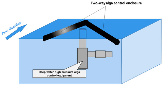 To demonstrate the feasibility of the high-pressure deep well alga control technology path, existing studies have provided strong evidence from both laboratory mechanisms and engineering field levels. At the mechanism level, Ma L. [14] found in an experiment of pressurizing cyanobacterial aggregates that, when the pressure was increased to 0.6 MPa, the removal rate of cyanobacterial biomass could reach 40%, and the removal rate of chlorophyll a could reach 87%, preliminarily verifying the effectiveness of the pressure-breaking technology from the mechanism perspective. Further, at the engineering verification level, Yan Q. [15] conducted a field study on the control of cyanobacteria in aquaculture water by deep well circulation treatment. The results showed that, after deep well pressurized circulation treatment, the concentration of chlorophyll a in the water decreased by 69%, and the total number of cyanobacterial cells decreased by 92%, fully demonstrating the engineering applicability and efficiency of this technology in real environments. The above studies together form a complete evidence chain from principle to practice for this technology, laying a solid theoretical and practical foundation for further optimization research on the structural parameters of the vortex well alga collector in this work. The specific layout is shown in Figure 3 below.