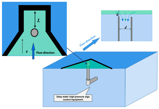When a deep-diving high-pressure alga controller is installed in water bodies, nutrient-rich algae naturally drain through its internal tubes. At 70 m depth, cyanobacteria cells are subjected to 0.7 MPa pressure, forcing them to disintegrate into small clusters or single-cell particles. The compression of gas vacuoles (false vacuoles) within cyanobacterial cells eliminates their buoyancy and biological activity, achieving rapid and efficient removal of surface algae. To ensure that the experimental results are universal, the inlet depth h, suction inlet diameter d, average water flow velocity v and distance of the fence L are selected as the research parameters. The specific parameters are shown in Figure 8.