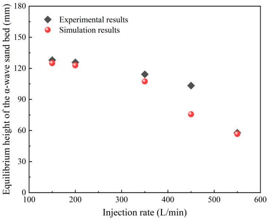 Figure 3 compares the simulated α-wave equilibrium bed height against experimental data from the validated model. The results demonstrate excellent agreement in both trend and magnitude. While minor deviations occur under specific conditions—potentially due to experimental uncertainty or localized model approximations—the overall consistency is strong, with all errors remaining within an acceptable margin. This high level of consistency validates the accuracy of the adopted CFD-DEM approach in simulating gravel transport and packing, thereby providing a credible foundation for subsequent investigations.