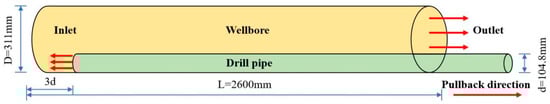 The numerical model for this study is based on engineering data from a hydrate trial production plan in the South China Sea. Since a full-scale simulation is computationally prohibitive, the geometry is rationally simplified while preserving key physical features and flow dynamic similarity. Specifically, the horizontal section is scaled down from 260 m to 2.6 m (1:100 ratio), while the radial dimensions—including the 311 mm wellbore and 104.8 mm drill pipe—are retained at a 1:1 field scale to function as a representative elementary volume (REV). This preserves the annular velocity field, ensuring that key dimensionless numbers (e.g., Reynolds and Archimedes numbers) match field conditions. Furthermore, the 2.6 m length is determined based on the hydraulic diameter (Dh = 206.2 mm). The domain length exceeds 12 Dh, surpassing the standard requirement (10 Dh) for establishing fully developed flow and stable particle transport. This simplification model (Figure 4) thus enhances computational efficiency without compromising the fidelity of core physical processes.