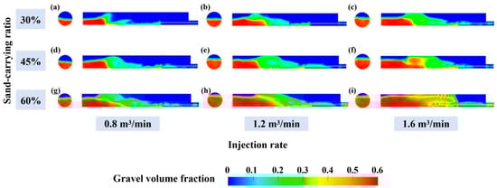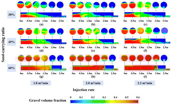 Analysis of the injection rate effect, as shown in Figure 6a–c, reveals that increasing the rate from 1.8 m3/min to 2.2 m3/min yields a slight rise in stable bed height and a moderately denser gravel accumulation. To be specific, this parameter increase elevates the average annular velocity from 0.45 m/s to 0.54 m/s. This higher velocity directly enhances the fluid’s turbulent carrying capacity, thereby reducing premature settling and promoting more effective gravel transport to the far end of the wellbore. Overall, however, varying the injection rate has a relatively limited impact on the overall packing structure. In contrast, the influence of the sand-carrying ratio is considerably more pronounced and critical. For instance, as shown in Figure 6i, increasing the sand-carrying ratio to 60% results in the formation of a dense and stable packed bed (with a gravel volume fraction exceeding 0.6), demonstrating desirable packing performance from the drill pipe exit to the end of the wellbore. Conversely, as depicted in Figure 6c,f, when the sand-carrying ratio remains at or below 45%, the gravel volume fraction is noticeably low within the high-velocity zone near the drill pipe exit, even though a stable bed of some height forms at the distal end. In this near-exit region, particles are subjected to strong fluid disturbances, resulting in loose packing and an unsatisfactory overall outcome.