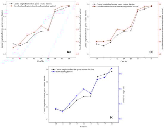 Comparison between the central longitudinal section gravel volume fraction and other metrics: (a) gravel volume fraction of arbitrary longitudinal section 1; (b) gravel volume fraction of arbitrary longitudinal section 2; (c) stable bed height ratio.