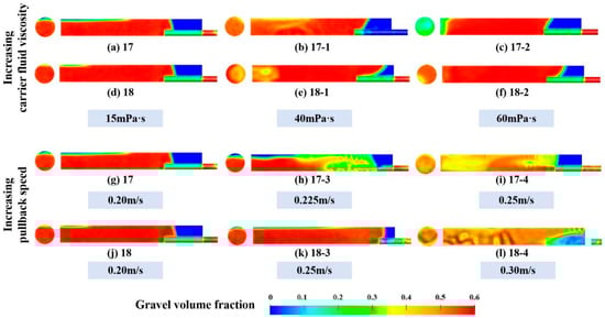 Simulation results for gravel packing effectiveness under different carrier fluid viscosities and pullback speeds. The plots correspond to the experimental cases detailed in Table 5 (Cases 17 and 18) and Table 9. (a) Case 17; (b) Case 17-1; (c) Case 17-2; (d) Case 18; (e) Case 18-1; (f) Case 18-2; (g) Case 17; (h) Case 17-3; (i) Case 17-4; (j) Case 18; (k) Case 18-3; (l) Case 18-4.
