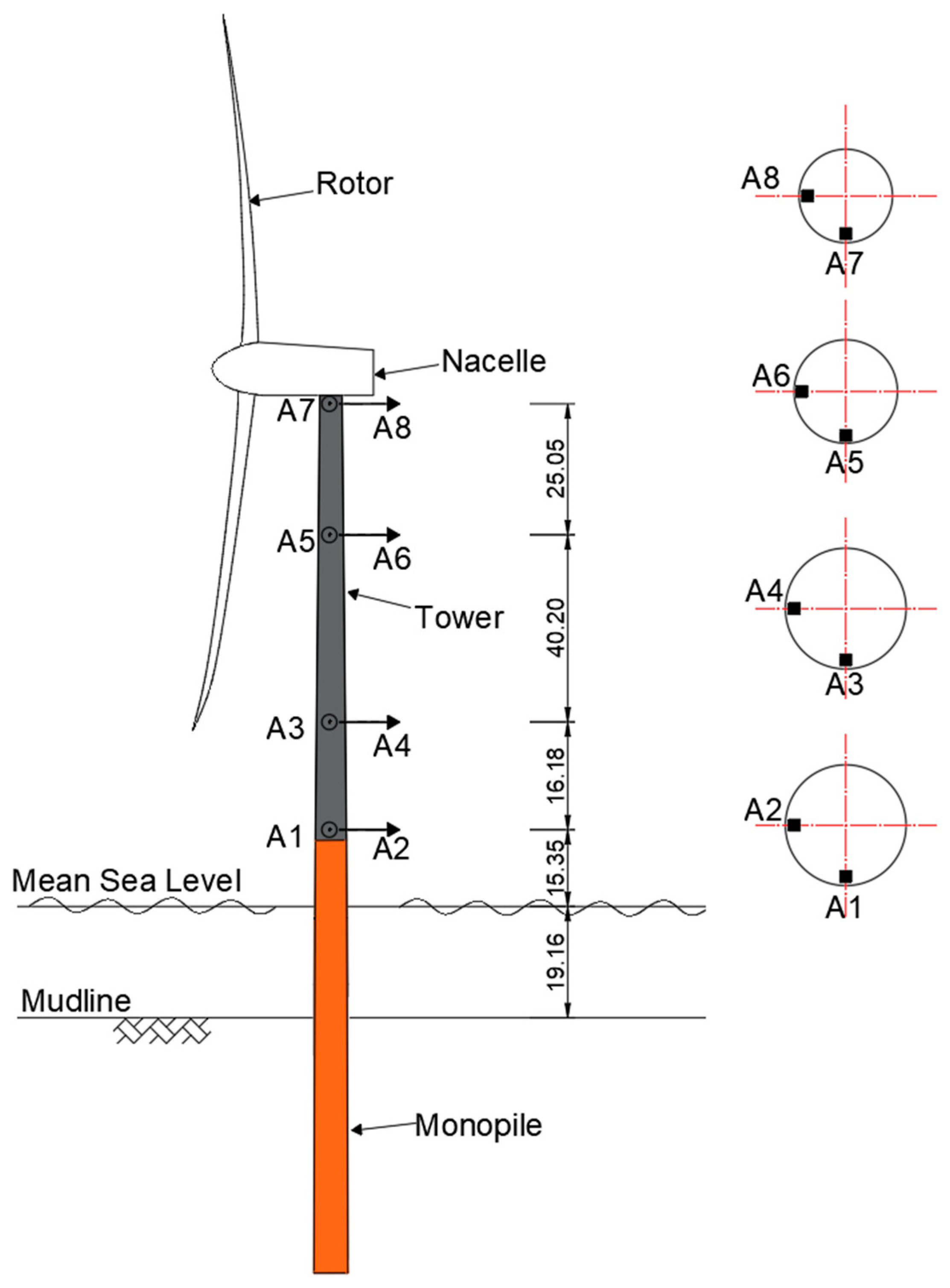 - Dong, X.; Lian, J.; Wang, H.; Yu, T.; Zhao, Y. Structural vibration monitoring and operational modal analysis of off-shore wind turbine structure. Ocean Eng. 2018, 150, 280–297. [Google Scholar] [CrossRef]