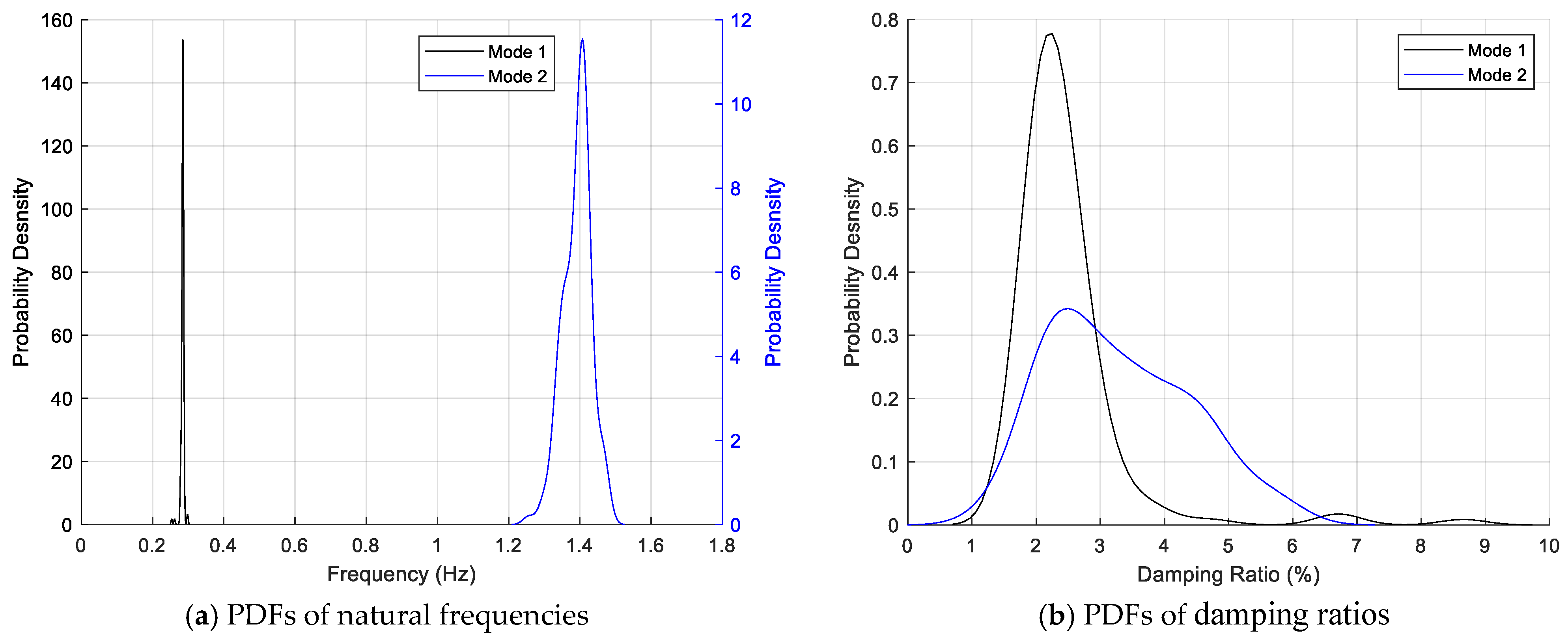 - Song, M.; Mehr, N.P.; Moaveni, B.; Hines, E.; Ebrahimian, H.; Bajric, A. One year monitoring of an offshore wind turbine: Variability of modal parameters to ambient and operational conditions. Eng. Struct. 2023, 297, 117022. [Google Scholar] [CrossRef]
