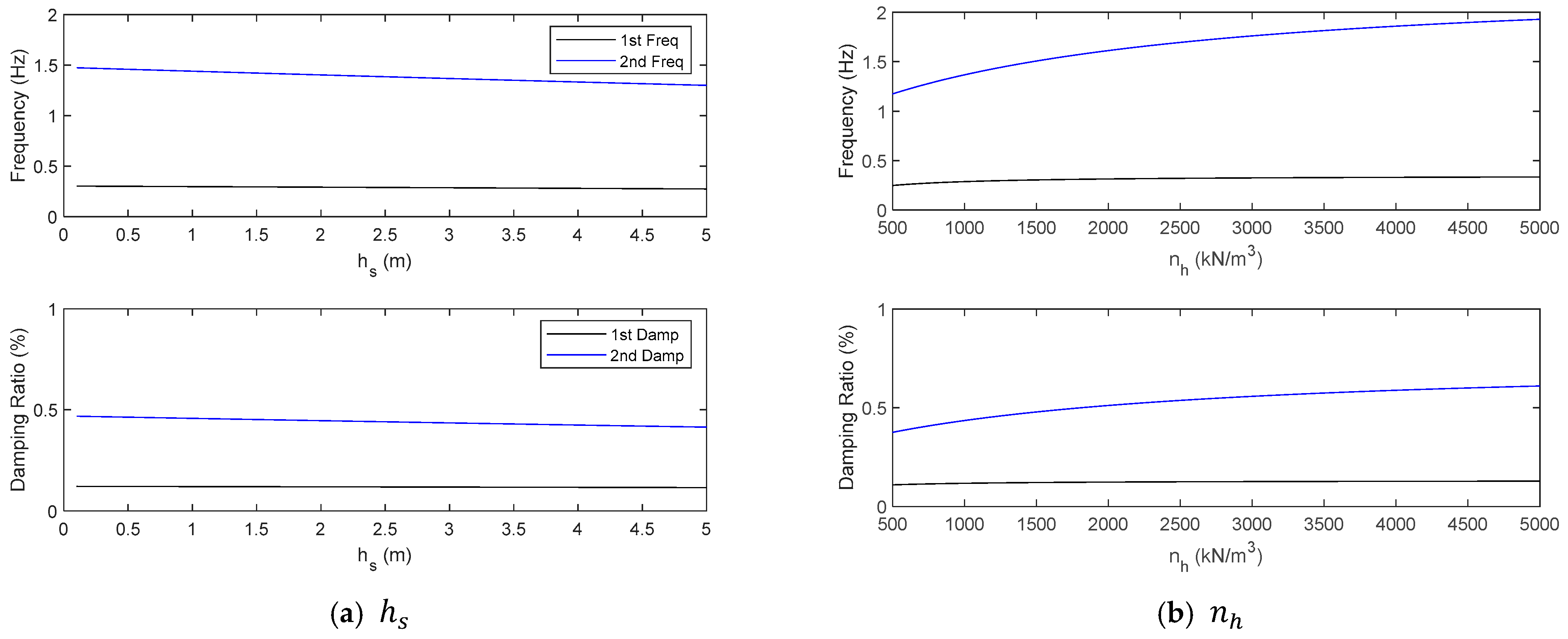 - Darvishi-Alamouti, S.; Bahaari, M.-R.; Moradi, M. Natural frequency of offshore wind turbines on rigid and flexible monopiles in cohesionless soils with linear stiffness distribution. Appl. Ocean Res. 2017, 68, 91–102. [Google Scholar] [CrossRef]