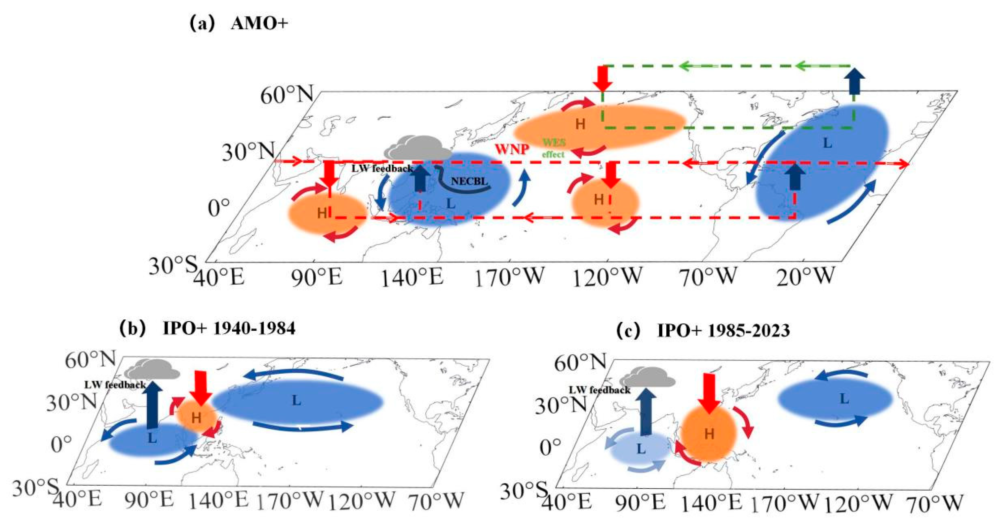 - Lu, Z.; Wang, C. Influence of three tropical oceans on western North Pacific anticyclone strengthening under global warming. npj Clim. Atmos. Sci. 2025, 8, 349. [Google Scholar] [CrossRef]