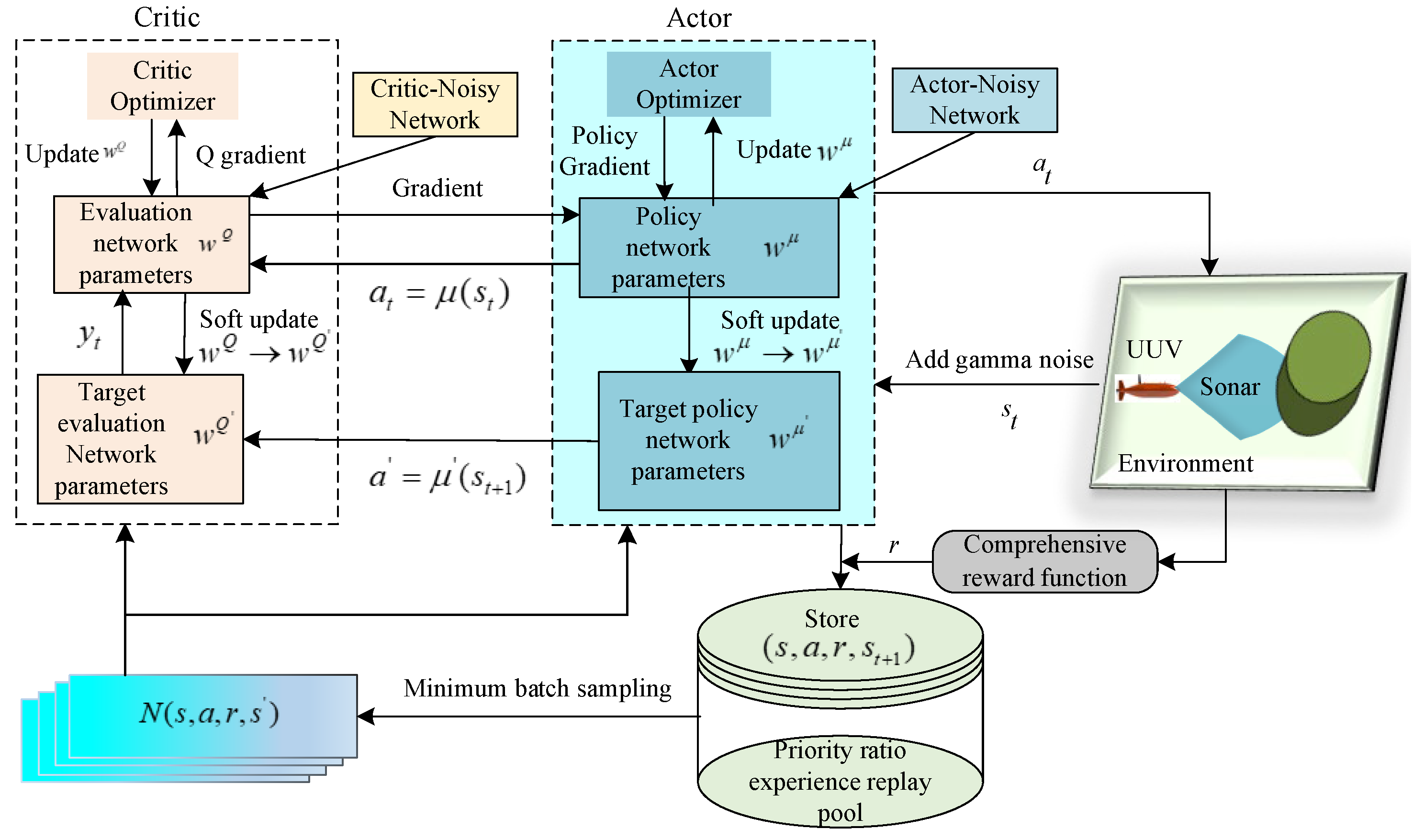 4] designed a DDPG collision avoidance algorithm in which two neural networks control the thruster and rudder angle position of the UUV, respectively. The reward function considers the distance from the obstacle to the sonar, as well as the difference between the current position and the previous position to the target point. Simulation results show that the UUV can plan a collision-free path in an unknown continuous environment. Sun et al. [