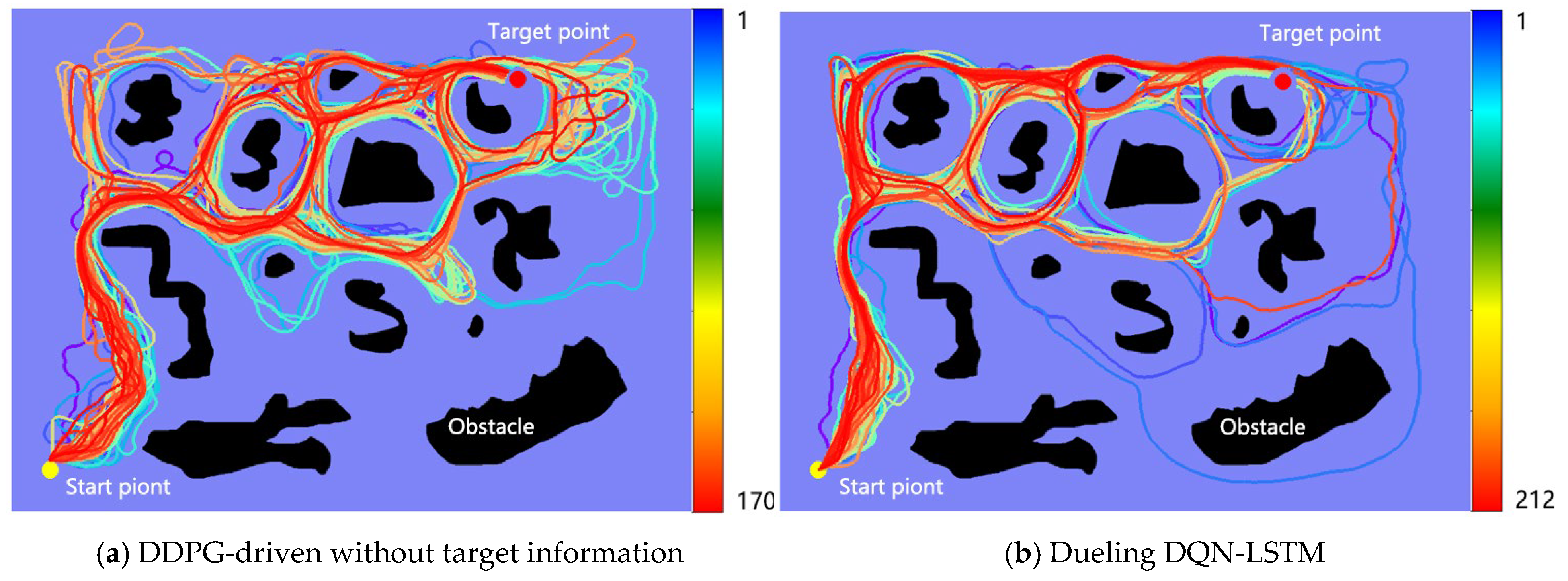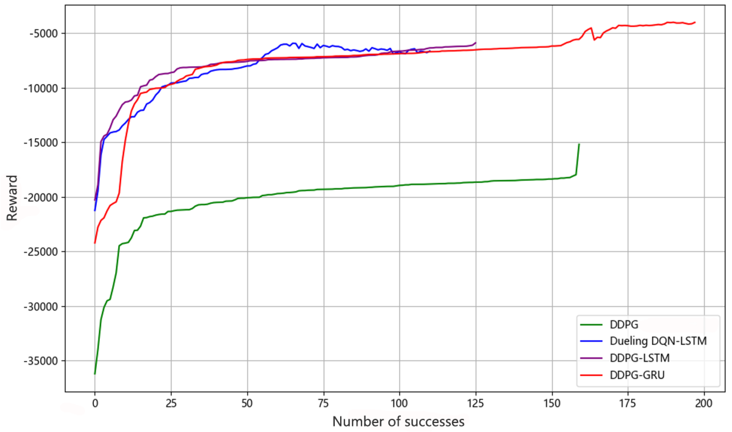 Figure 16, the traditional improved PSO + DWA and DQN algorithms cannot reach the target point safely, and it is difficult to complete obstacle avoidance planning in highly dynamic scenes.