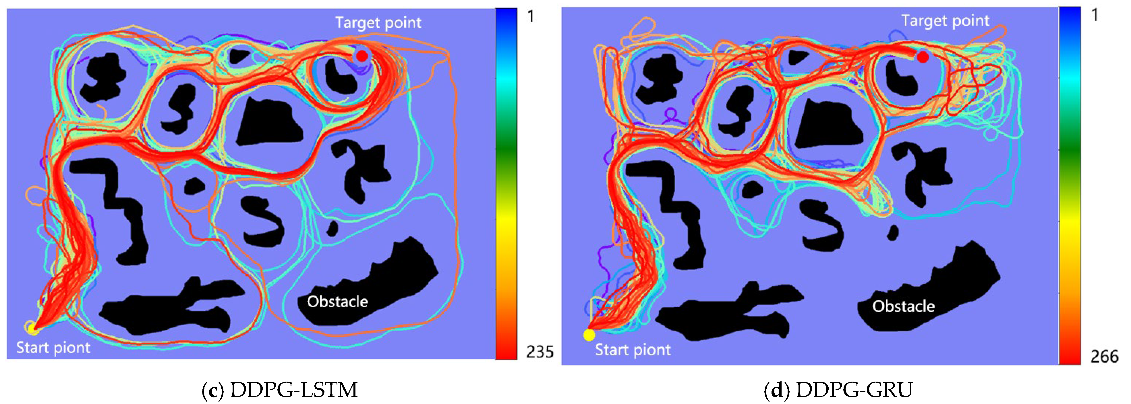 When facing multiple dynamic obstacles, the UUV’s collision avoidance planning ability is not as good as the DWA algorithm with curvature constraints. In the future, it is planned to add the ability to perceive dynamic obstacles to the model, use the extended Kalman filter (EKF) for online filtering and trajectory prediction of dynamic obstacles, integrate the EKF output into the state input of DRL, and introduce the reward function of dynamic obstacles. Use the LSTM/GRU network to help the UUV remember the movement trend of obstacles in the past few steps to improve the collision avoidance prediction ability.