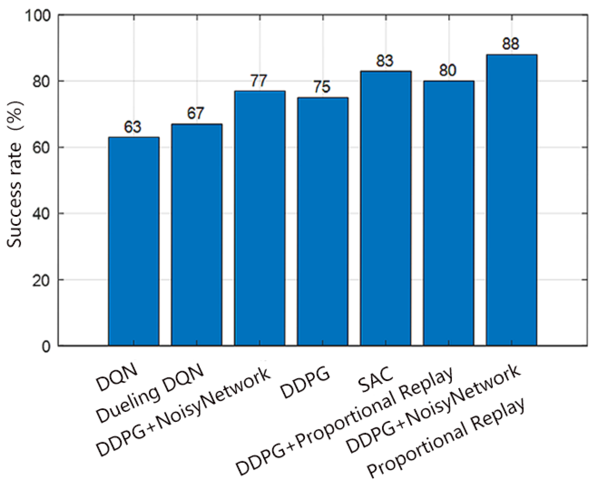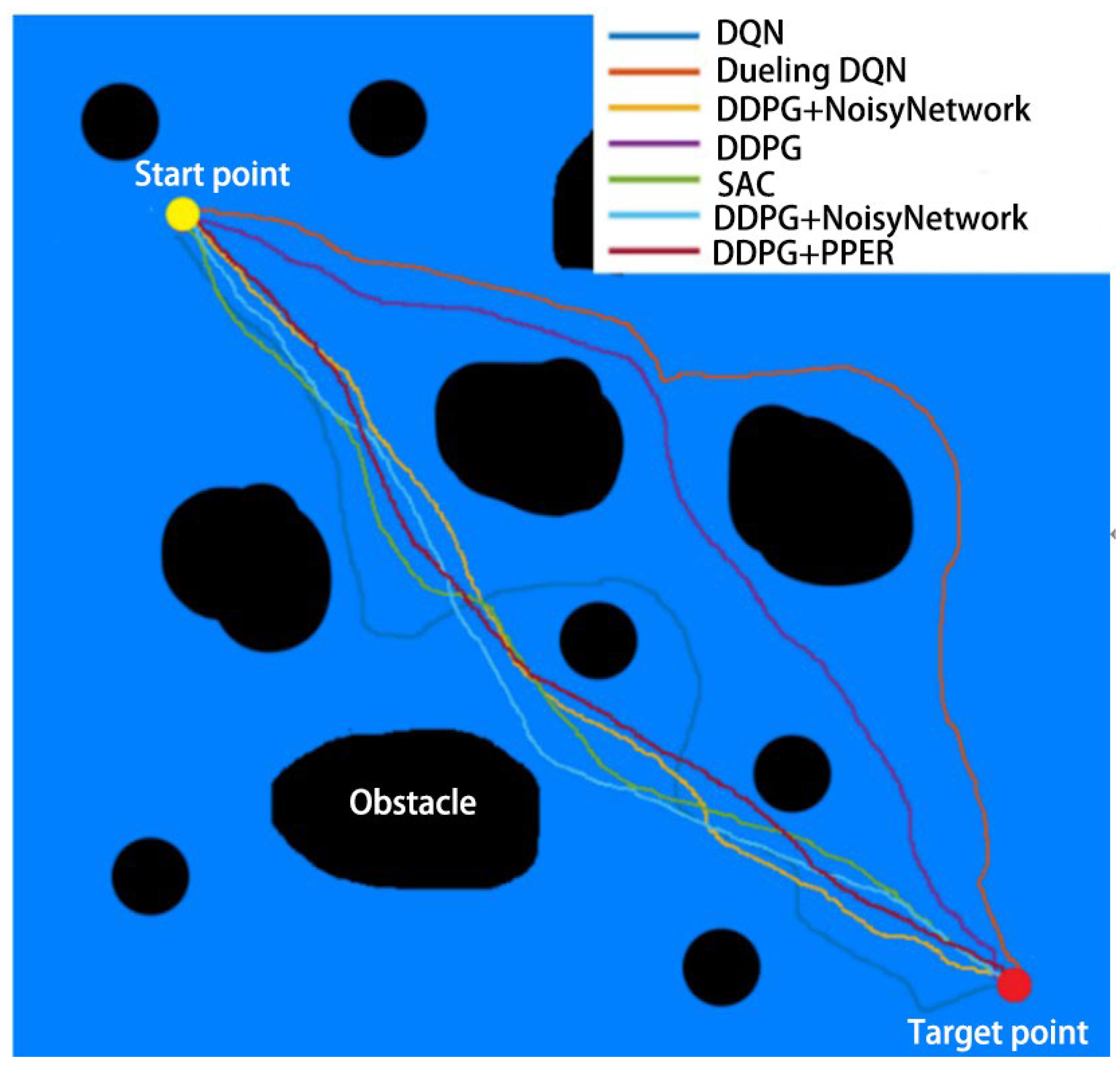 Table 6. The experiment compares the autonomous collision avoidance performance of PSO combined with five algorithms, DWA, DQN, Dueling DQN, SAC, and DDPG, in a dynamic environment to evaluate the effectiveness and stability of these algorithms in dealing with environmental uncertainty.