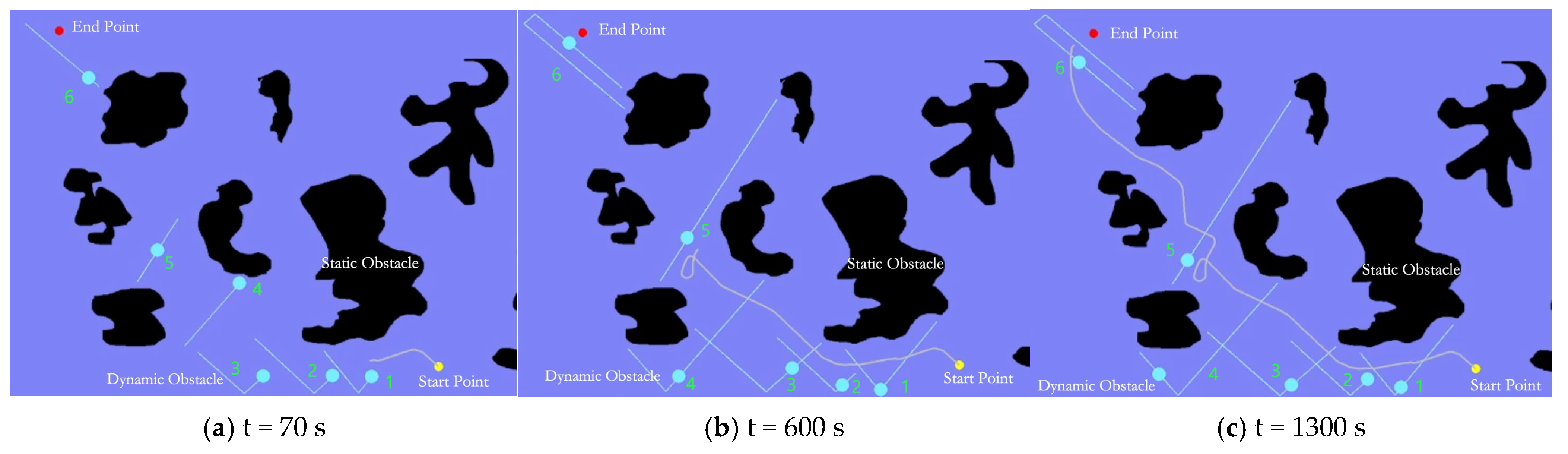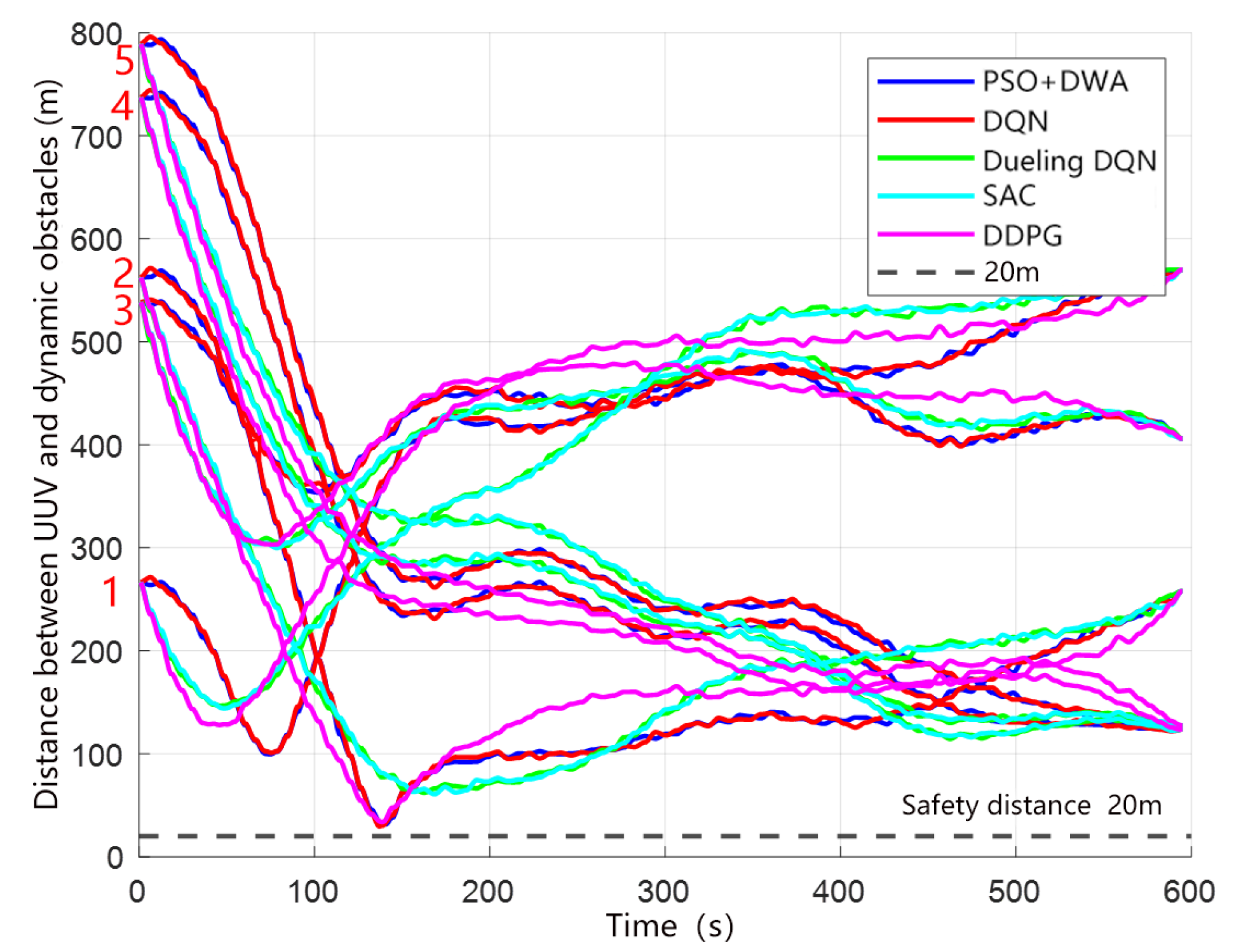 Figure 10. The performance of each algorithm in the figure can be evaluated by the change in the distance between the UUV and the dynamic obstacle over time. The longer the distance, the better the obstacle avoidance effect. The figure shows that the distance between the algorithm proposed in this paper and the dynamic obstacle is greater than 20 m, indicating that the UUV successfully avoided collisions with dynamic obstacles in all simulations of the autonomous collision avoidance planning algorithm.