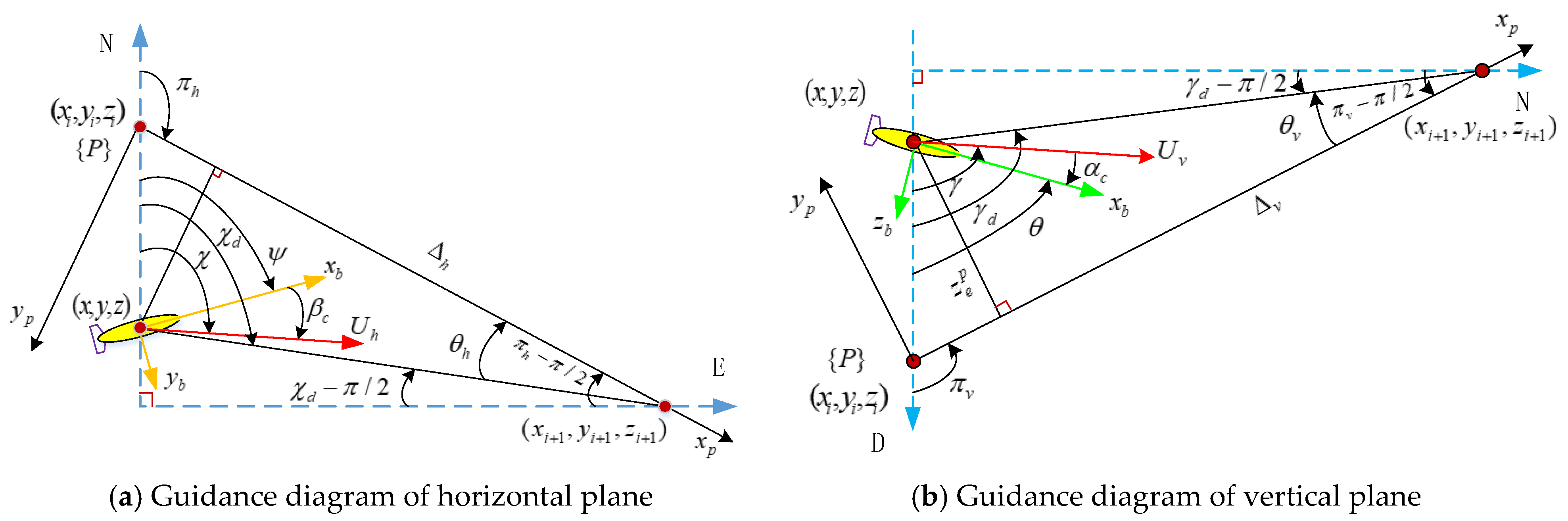 Theorem 1. Consider a three-dimensional path-following system for a UUV guided by the adaptive line-of-sight (ALOS) method. The system dynamics are decoupled into a horizontal guidance subsystem and a vertical guidance subsystem as follows: