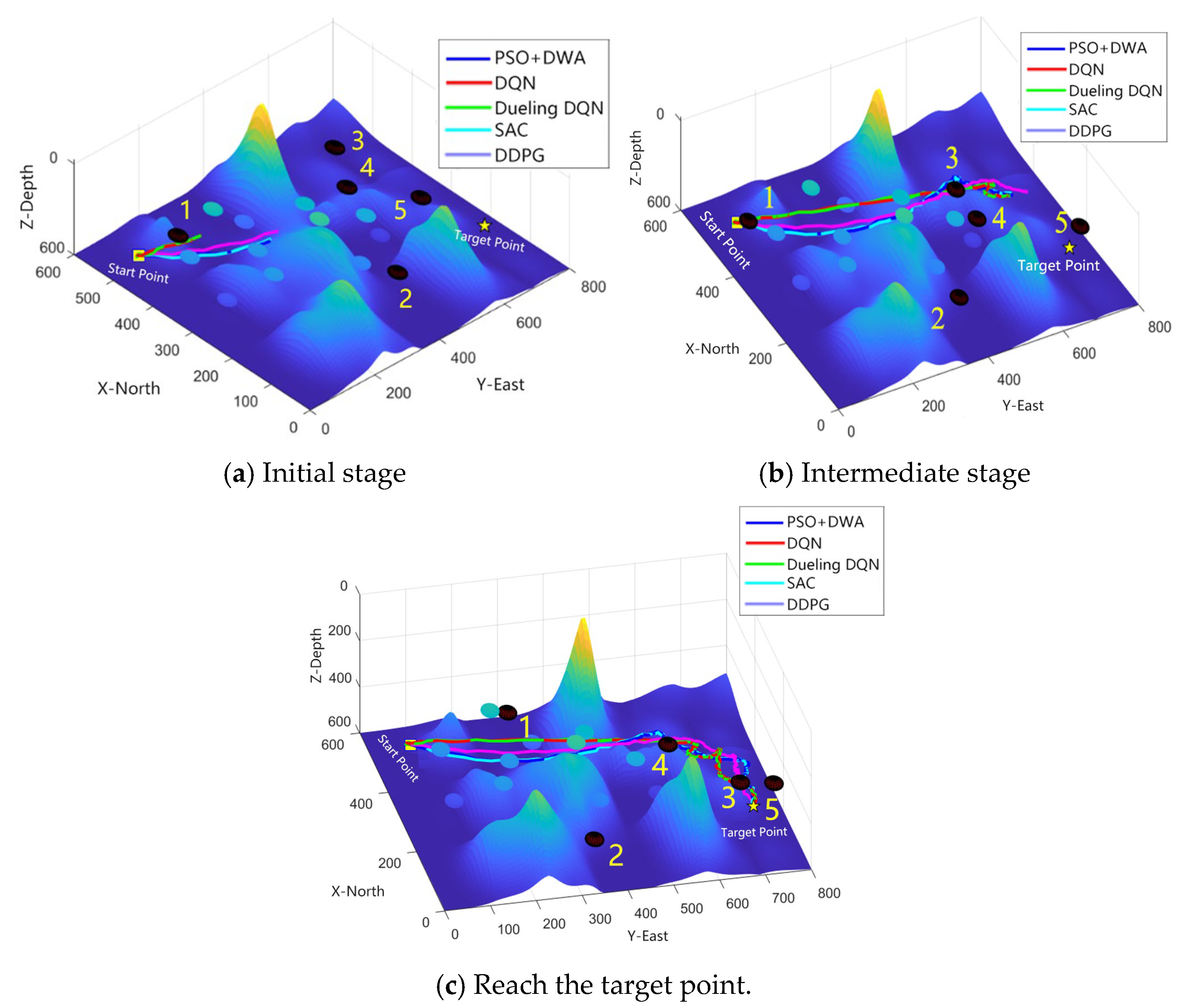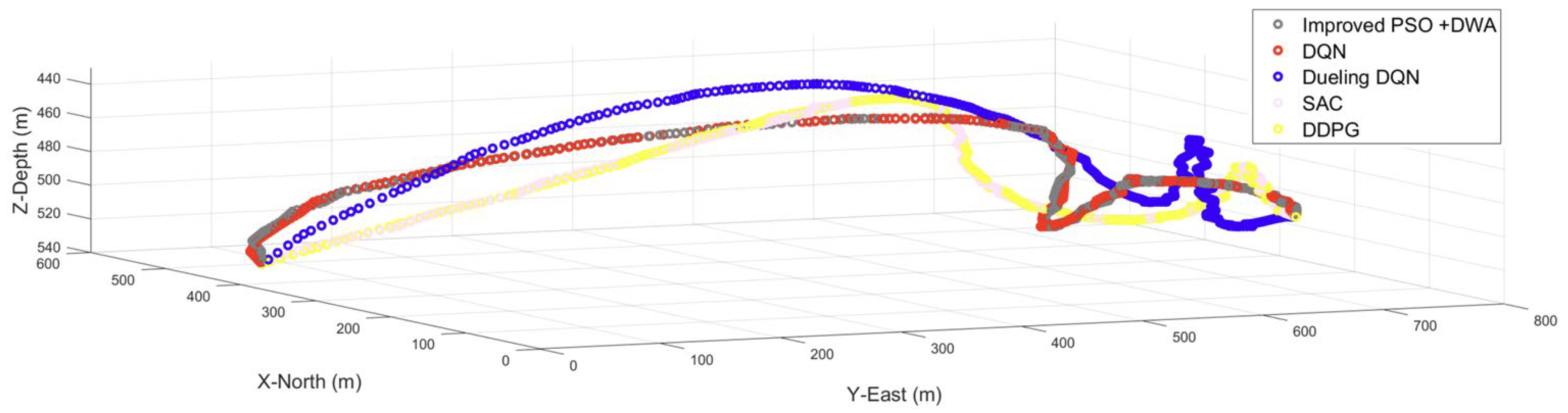 Table 7 summarizes the path length, planning time, and minimum distance to dynamic obstacles of different algorithms. The results show that the DDPG algorithm generates the shortest path, while the DQN algorithm has the shortest average single-step planning time, that is, the output speed of the control command is the fastest. In contrast, the planning time of PSO combined with DWA is the longest, mainly because in a three-dimensional dynamic environment, the improved PSO requires multiple iterations to optimize the optimal global route, and the DWA algorithm with curvature constraints is also time-consuming each time it predicts the trajectory. In addition, the DWA algorithm with curvature constraints also consumes a lot of time to calculate the predicted trajectory each time. PSO combined with DWA, DQN, and DDPG are similar in the minimum distance to a certain dynamic obstacle. They can all effectively avoid obstacles and ensure the safe navigation of UUVs in complex environments. Relatively speaking, although the path lengths of Dueling DQN and SAC are greater than those of DDPG, their minimum collision avoidance distances with dynamic obstacles are larger, which also reflects a certain degree of safety redundancy.