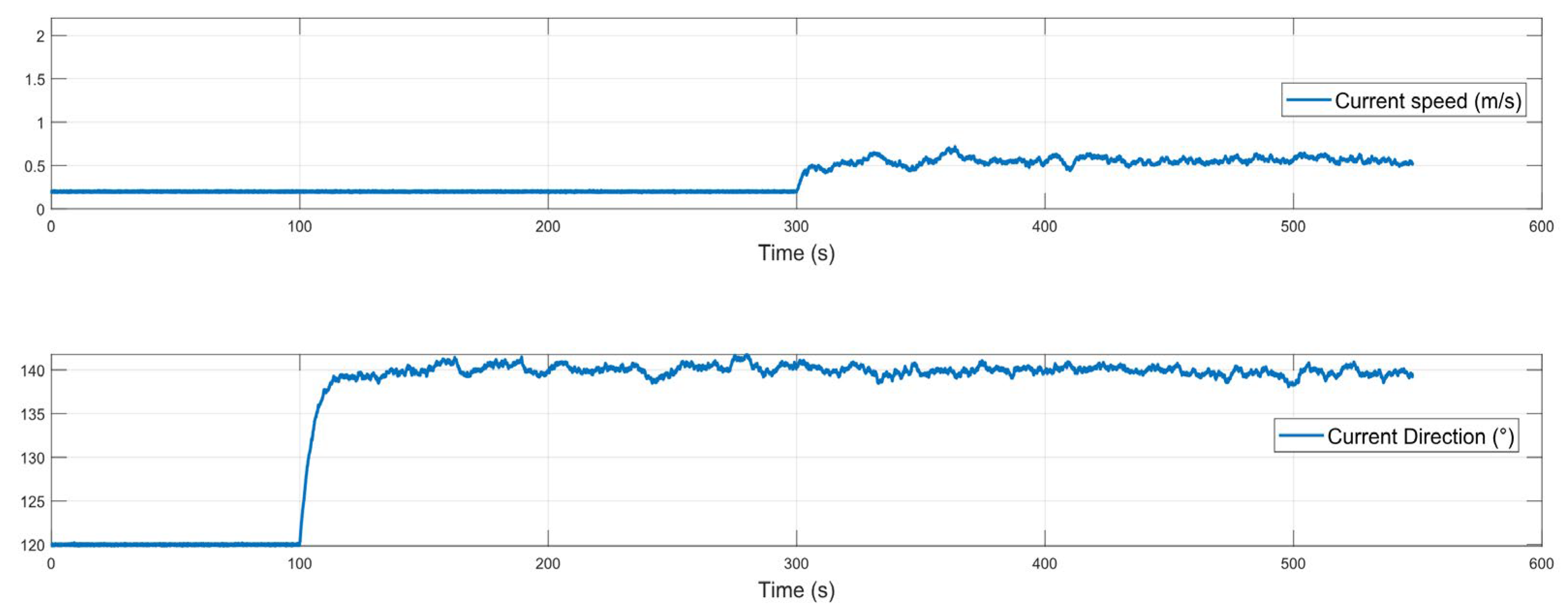 Under the influence of ocean current disturbance, the UUV’s longitudinal velocity, sway velocity, and bow angle will change due to external environmental interference, and the phase angles and will also change accordingly, which will cause the horizontal front sight component and the vertical front sight component determined by Formulas (40) and (41) to also change. In order to simplify the complexity of tracking, the concept of relative velocity is used to simulate ocean current disturbance. In the process of straight-line path tracking, the following assumptions are made: