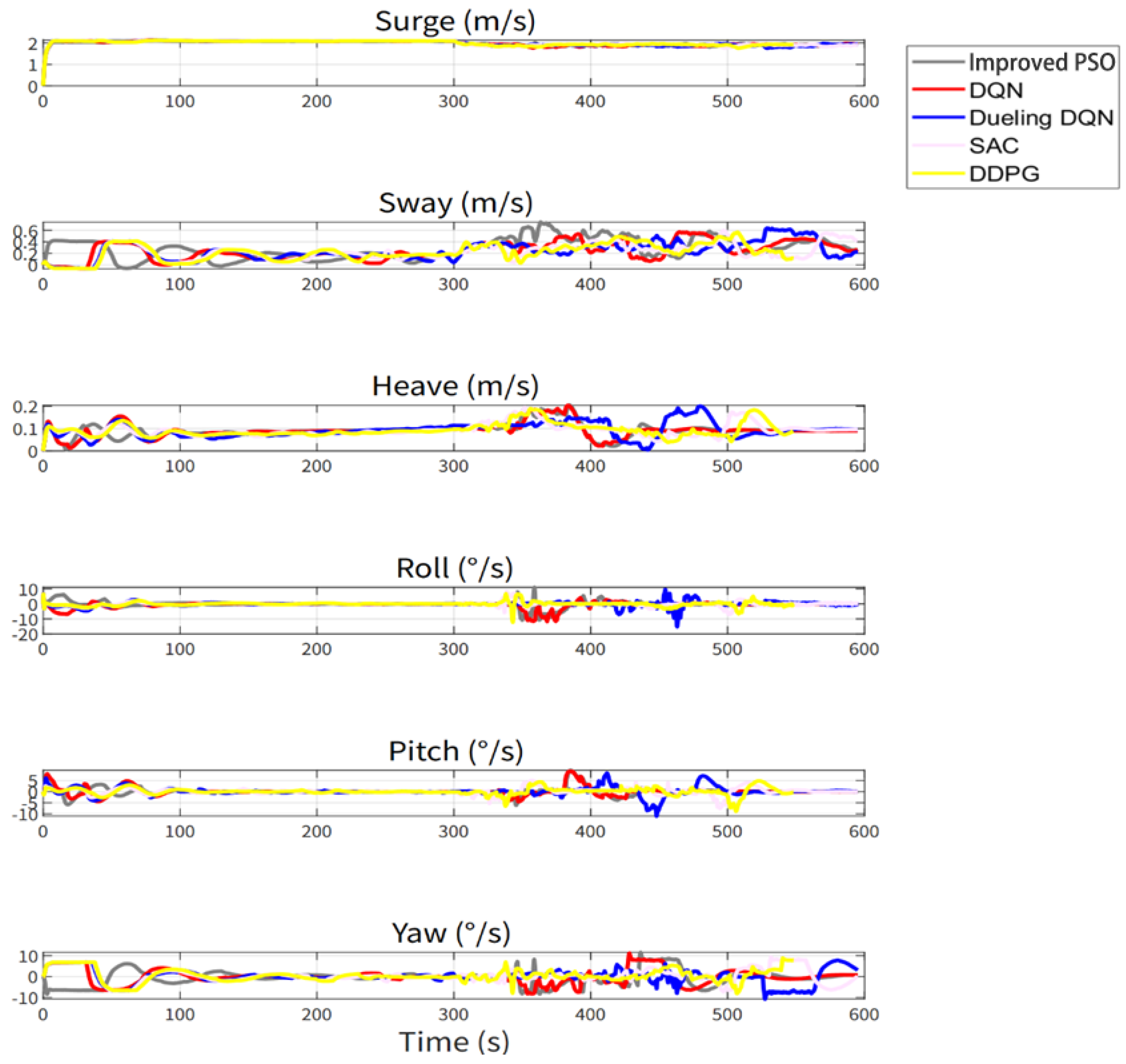 Figure 17 shows that in the presence of ocean current interference, the proposed three-dimensional ALOS guidance algorithm has relatively stable speed control in the longitudinal direction, indicating good control capability of the UUV longitudinal speed; all attitude quantities remain stable before 300 s, and the roll angular velocity and pitch angular velocity are close to 0 between 100 s and 300 s; between 300 s and 500 s, the collision avoidance behavior of each collision avoidance planning algorithm against dynamic obstacles causes fluctuations in attitude quantities. Combined with