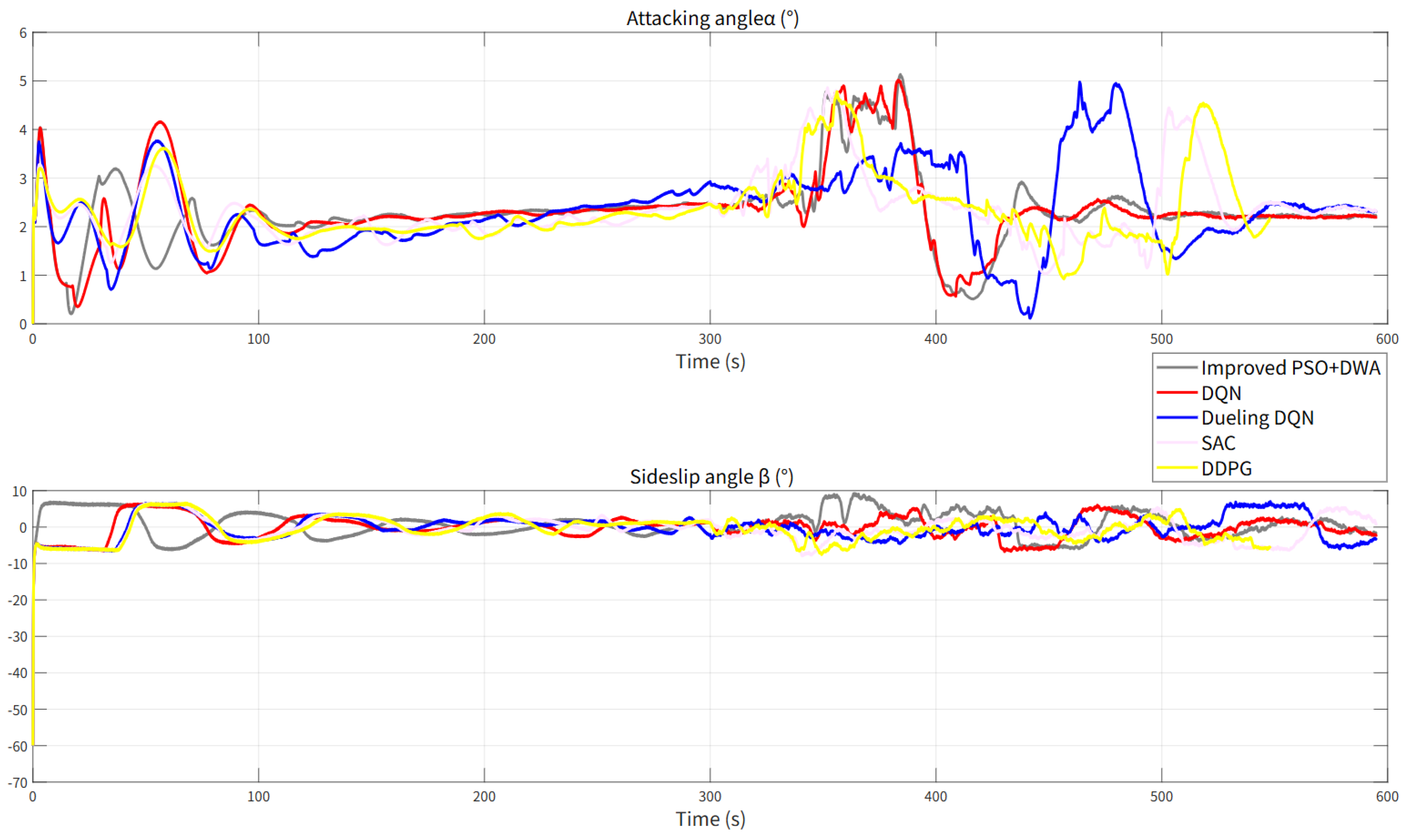 during the navigation process of the UUV under different planning algorithms. The angle of attack of each planning algorithm is positive at the initial moment, indicating that the UUV is in the climbing stage. This is consistent with the path trajectory of