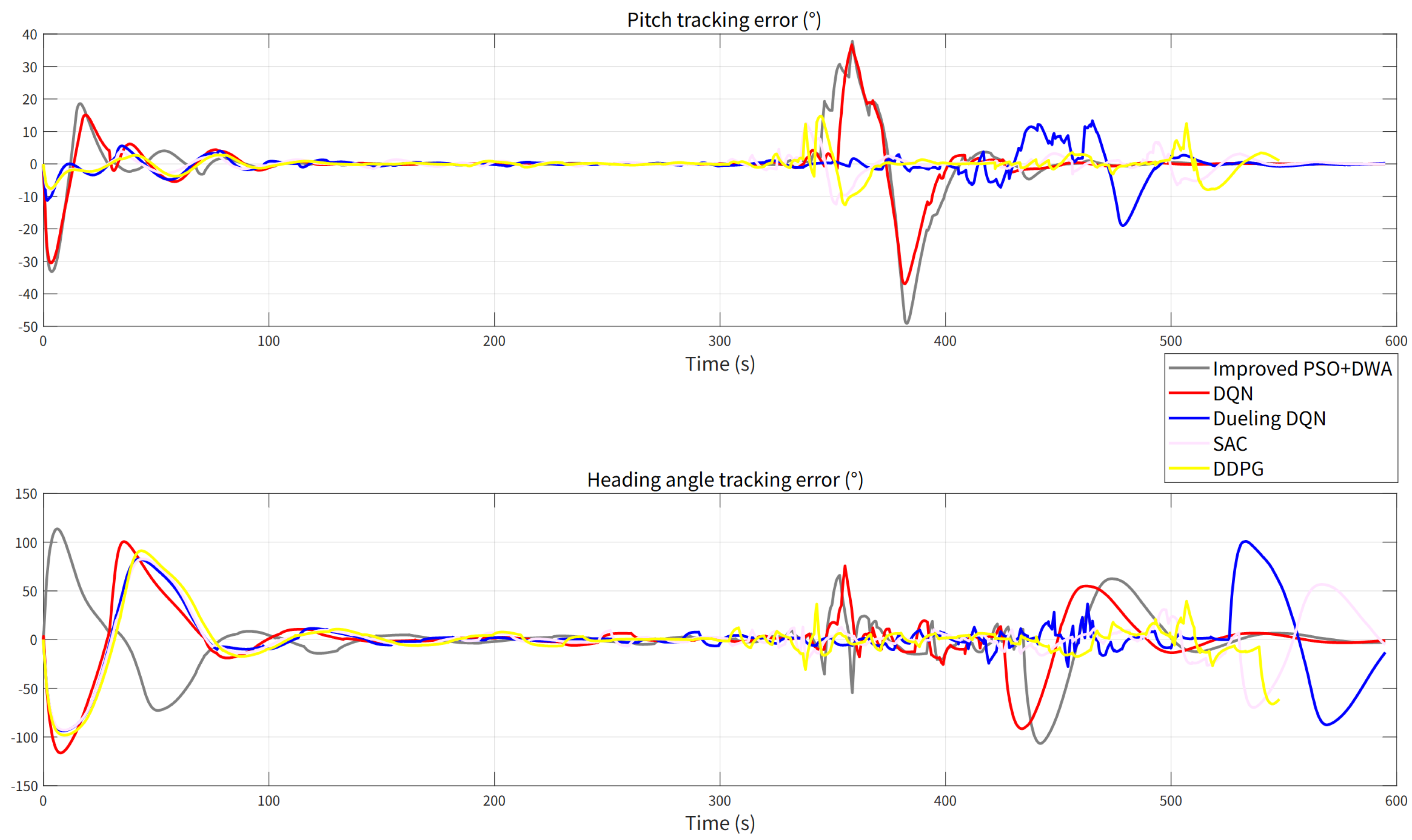 Figure 19 shows the pitch angle and bow angle tracking errors of each algorithm. In the variable depth collision avoidance planning and three-dimensional route tracking tasks, the DDPG algorithm performs best in pitch angle, bow angle, and position error indicators, showing good route tracking accuracy. The SAC algorithm also has high attitude and trajectory control capabilities and is suitable for autonomous navigation in dynamic and complex environments. DQN and Dueling DQN have certain deficiencies in attitude control accuracy and trajectory smoothness. As shown in