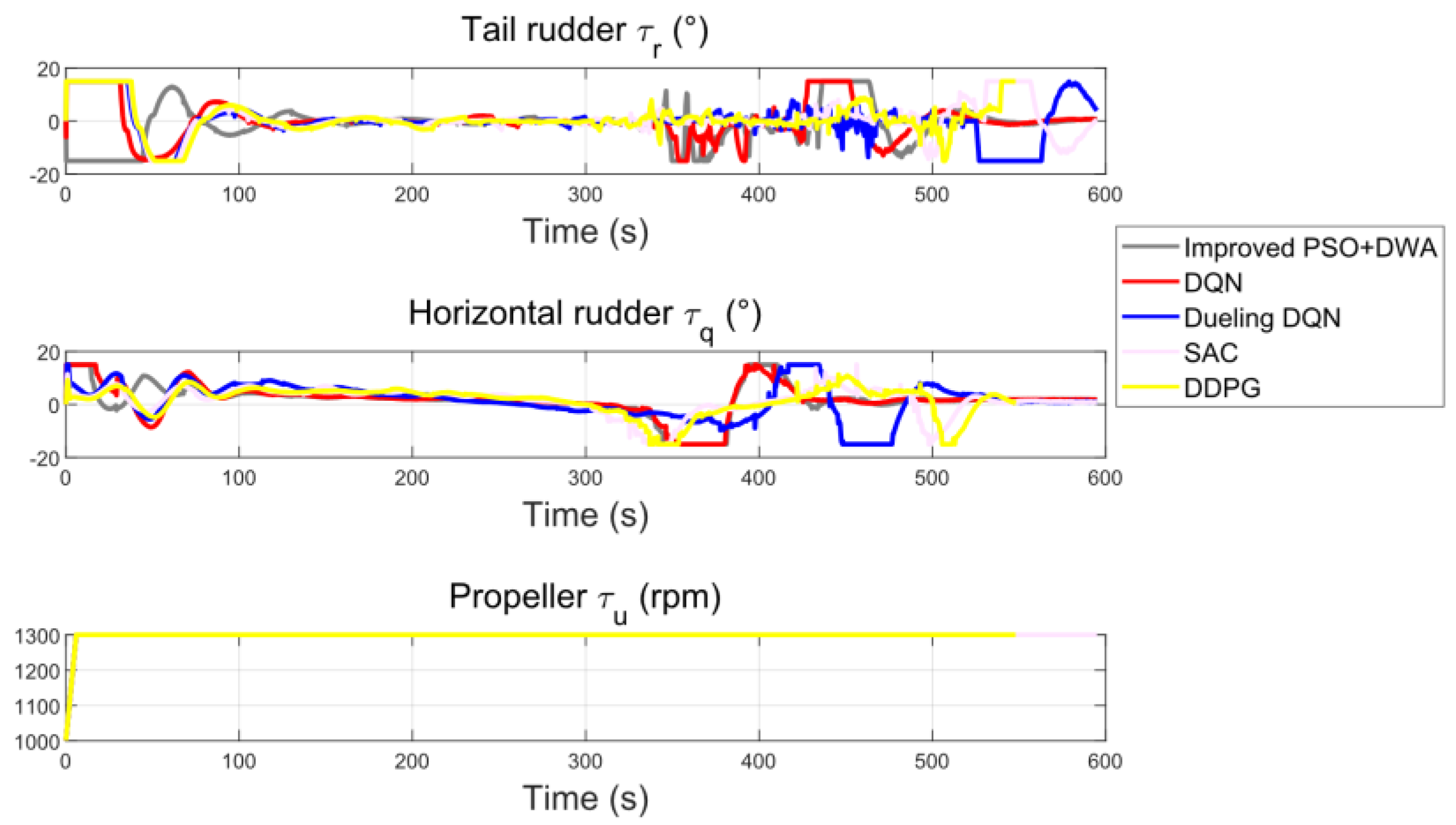 Figure 20, different planning algorithms, DDPG and SAC, have the smallest fluctuations in the changes in horizontal rudder angle and tail rudder angle, and the control is smoother; the thruster speed of each method can be maintained stably, ensuring the UUV speed stability and track tracking continuity.