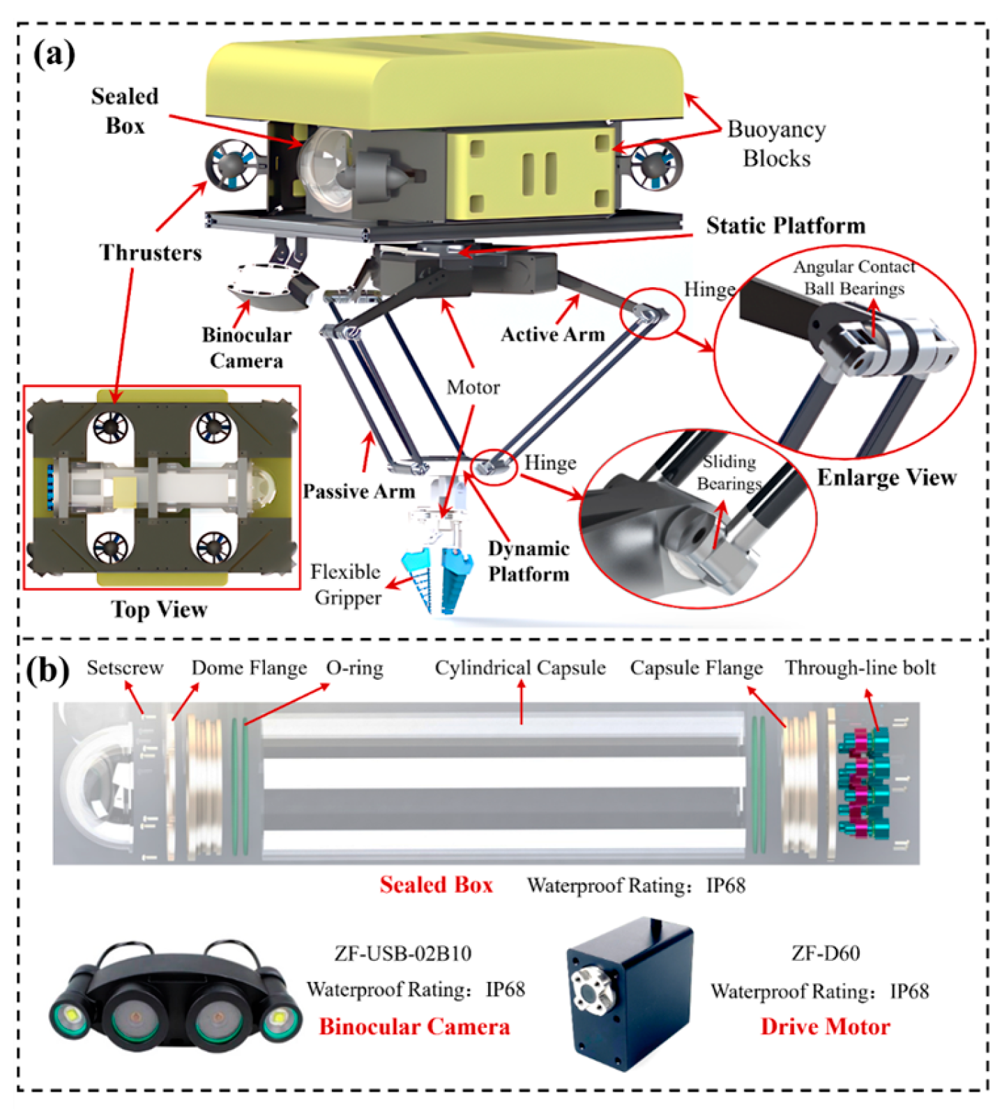 To achieve precise manipulation of the lower Delta gripper unit, a waterproof binocular camera (ZF-USB-02B10, Zhi-fan Marine Equipment Co., Ltd., Weihai, China) is mounted on the floating-motion unit for real-time observation and illumination. The essential hardware components, including power supplies, motion controllers, camera drivers, and sensors, are enclosed within a sealed acrylic box, centrally positioned to minimize hydrodynamic interference. This modular design not only simplifies integration but also accommodates additional payloads such as sampling tools or mining-specific sensors, which are essential in deep-sea operations.
