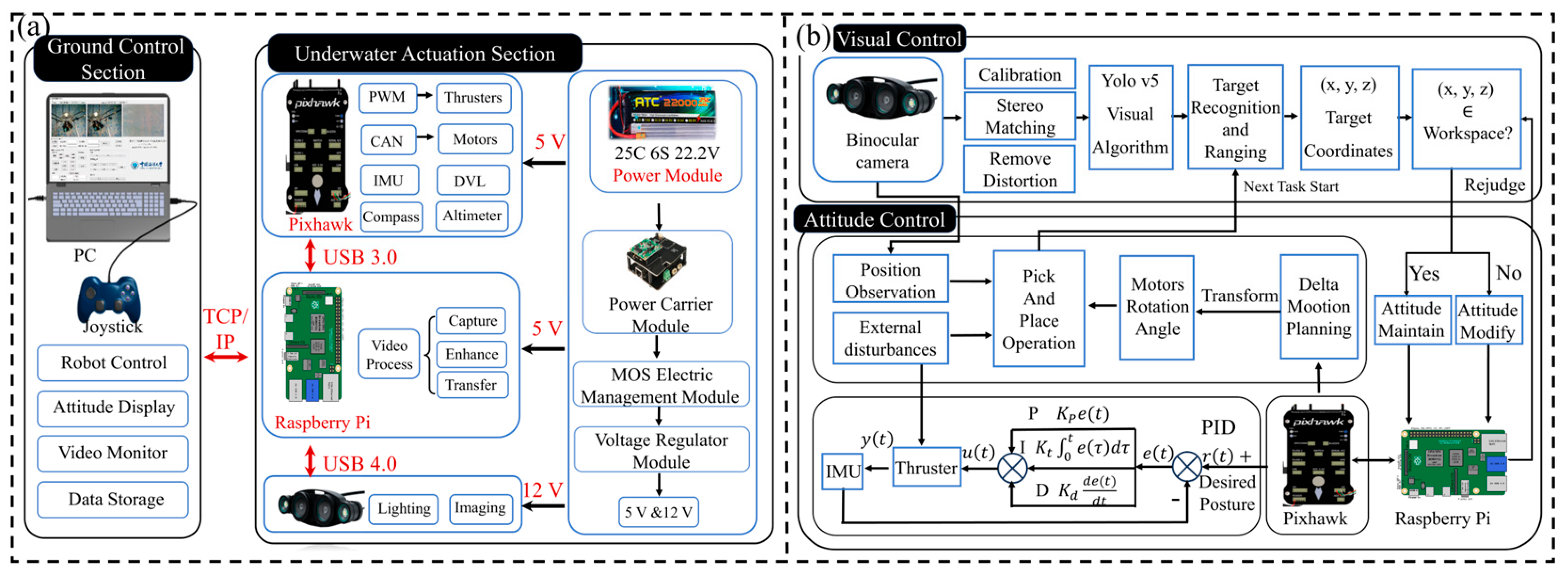 The Pixhawk 2.4.8 serves as the execution unit, integrating an electronic compass, Inertial Measurement Unit (IMU), Doppler Velocity Logger (DVL), and altimeter. This integration is crucial for underwater mining tasks, where reliable localization and station-keeping are essential to prevent sediment plumes from disrupting visibility or to avoid damaging valuable mineral deposits. The Raspberry Pi pre-compiles and executes the code responsible for controlling motors and servos, functioning as the central controller. It receives commands from the Ground Control Section via the umbilical cable, processes these inputs, and generates RC and PWM signals for the Pixhawk. These signals precisely actuate thrusters and Delta robot joints. The binocular camera, connected via USB 4.0, captures real-time images of the working environment. This dual-layer control architecture enhances fault tolerance, ensuring continuity of operations even under the unstable communication conditions often encountered in underwater missions.