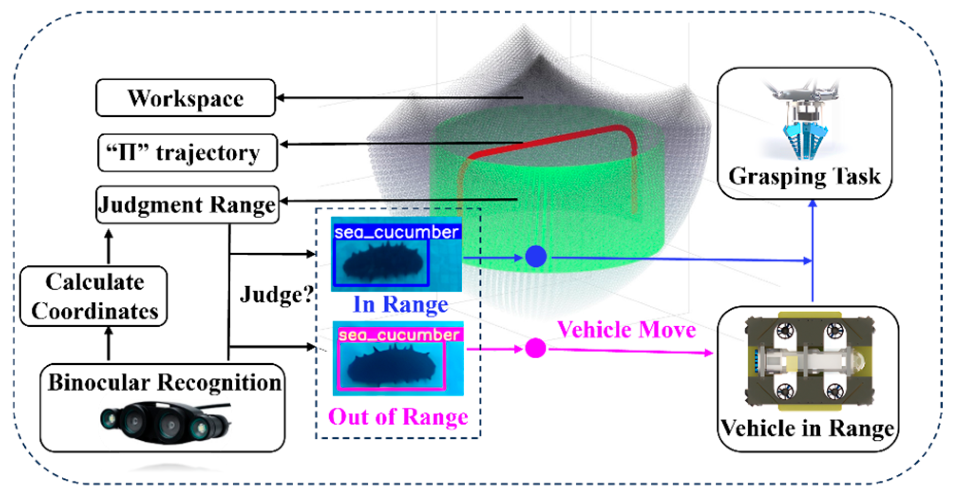 As described above, the proposed UVMS demonstrates the capability to perform underwater grasping tasks with the assistance of a binocular camera. To validate its effectiveness, a series of grasping experiments were conducted using a sea cucumber model. The grasping process, supported by binocular vision, unfolds as follows: Initially, the UVMS is maneuvered via PC and joystick control to approach the target, ensuring it enters the binocular camera’s recognition range. A predefined boundary range is established within the workspace of the lower Delta gripper unit, with these boundary points integrated into the binocular recognition algorithm to assess the feasibility of the grasping operation. If the target lies outside the Delta robot’s workspace, the recognition frame turns red, prompting the UVMS to autonomously adjust its attitude and reposition the Delta robot within the workspace. The capture logic, detailed in
