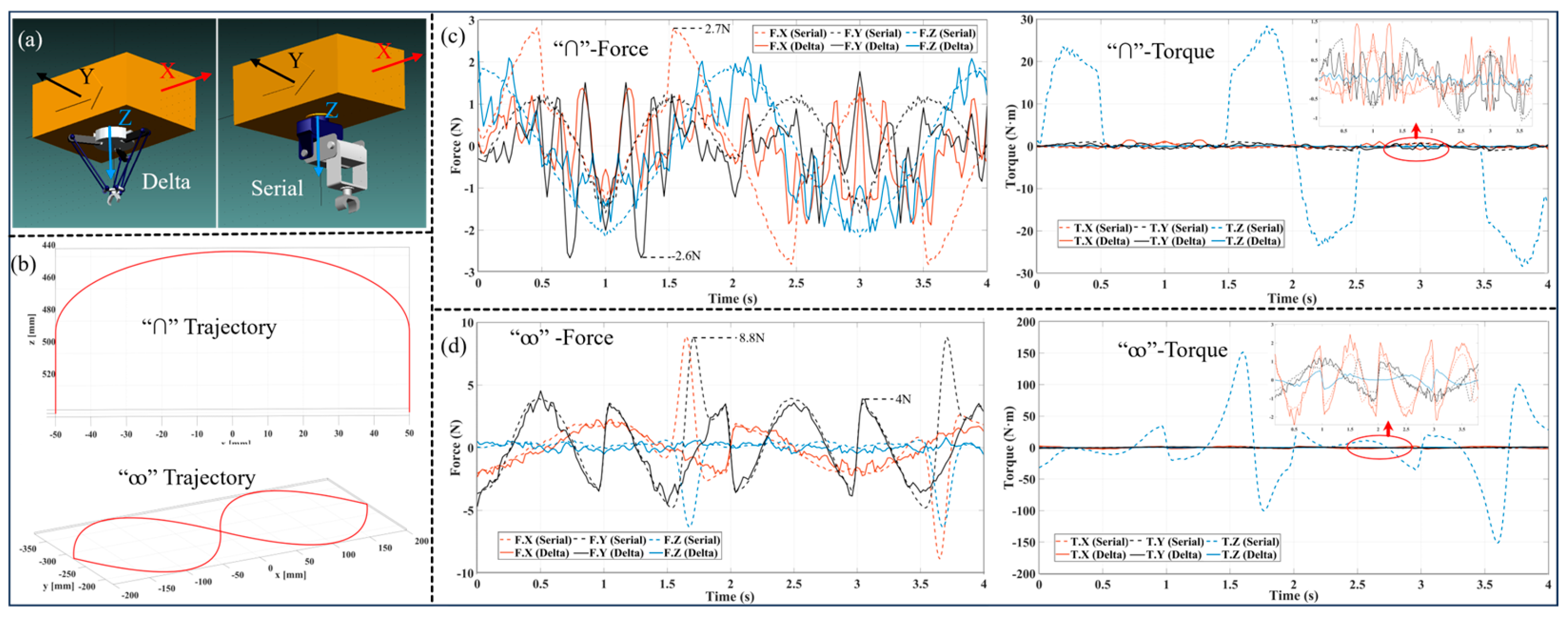 Figure 6a), the Delta manipulator outperformed its serial counterpart across all axes. For example, in the x-direction, the maximum deviation of the Delta system was ~45 mm, compared to ~227 mm for the serial manipulator. During the “∞” trajectory (