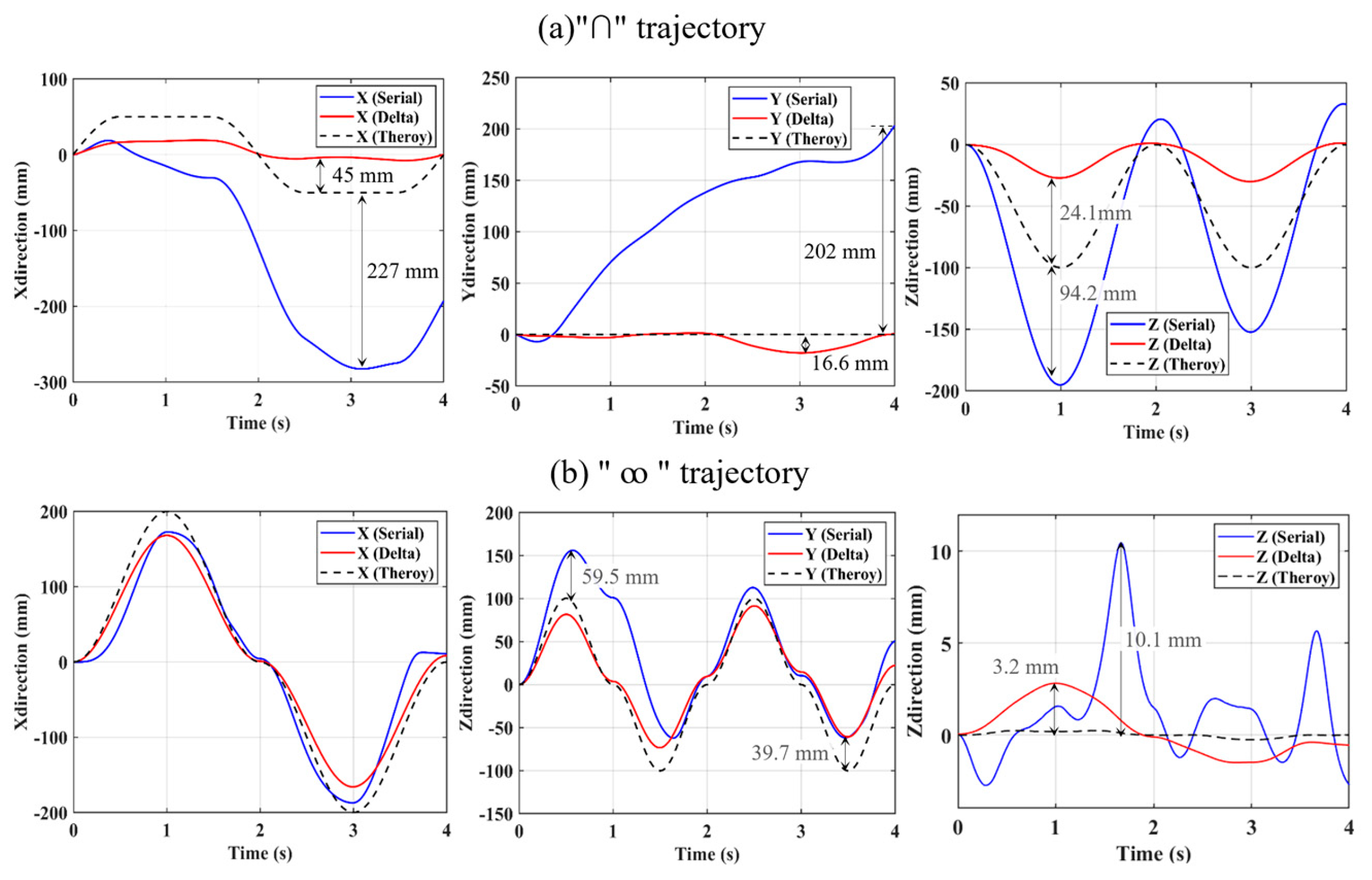 These improvements stem from the structural alignment of the Delta manipulator, which extends vertically downward beneath its base, enabling motions that are naturally aligned with the vehicle body. Although this introduces challenges in precise z-direction control, the overall three-dimensional error accumulation remained significantly lower than that of the serial configuration.