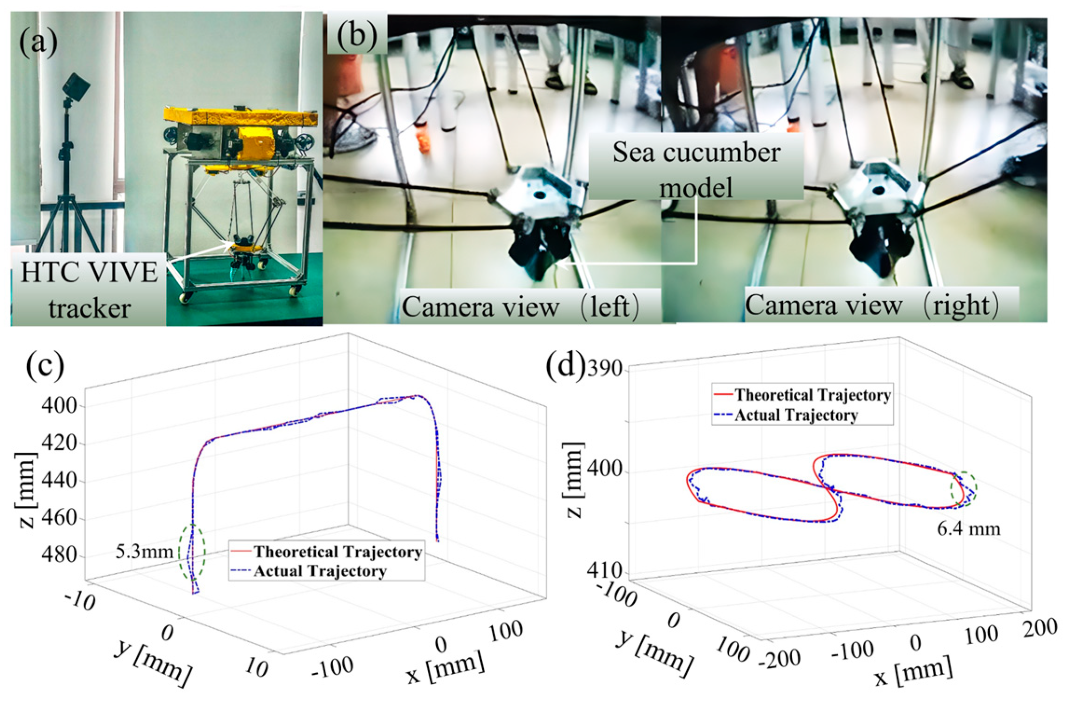 Figure 7c,d, demonstrate that the Delta robot could follow predetermined trajectories with a maximum deviation of 6.4 mm. This deviation can be attributed to factors such as friction variations due to insufficient lubrication among the rods and inaccuracies in position and velocity control, which occasionally led to arm decoupling. Enhanced lubrication and refined control algorithms are expected to reduce these discontinuities. However, the current level of trajectory-following precision is deemed sufficient for the operational requirements of underwater vehicle-manipulator systems.