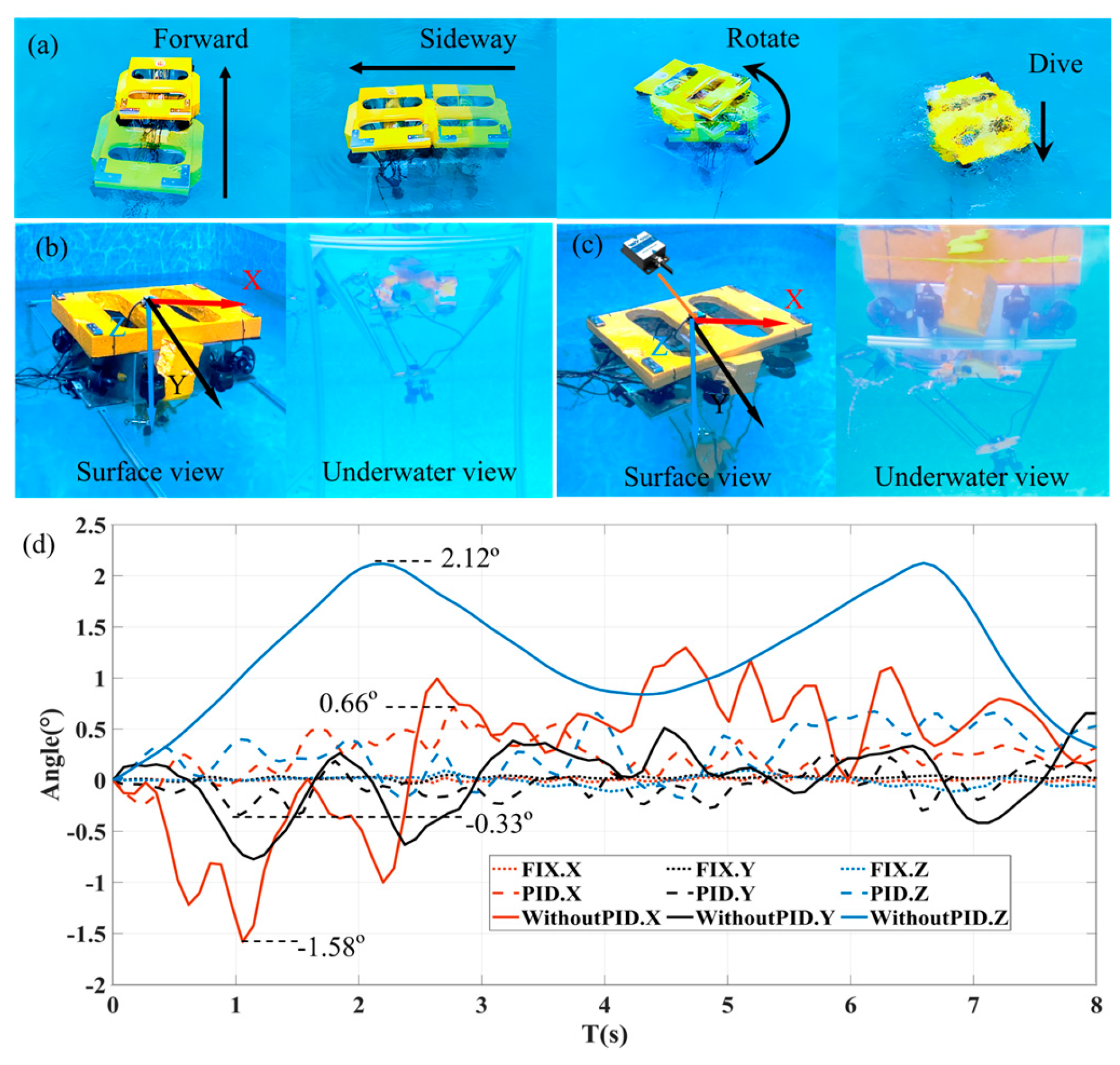 Figure 8b,c, with the waterproof angle sensor (HWT901B-TTL, WIT Co., Yancheng, China, IP68 waterproof rating) placed at the top center of the vehicle’s body to monitor angular variations along the x, y, and z axes during the trajectory execution. The experiments were grouped as follows: a control group with a fixed stationary body, an experimental group with a floating body using open-loop control, and an experimental group with a floating body utilizing PID control. The Delta robotic arms were controlled to follow a predefined “∩” trajectory during the trials.