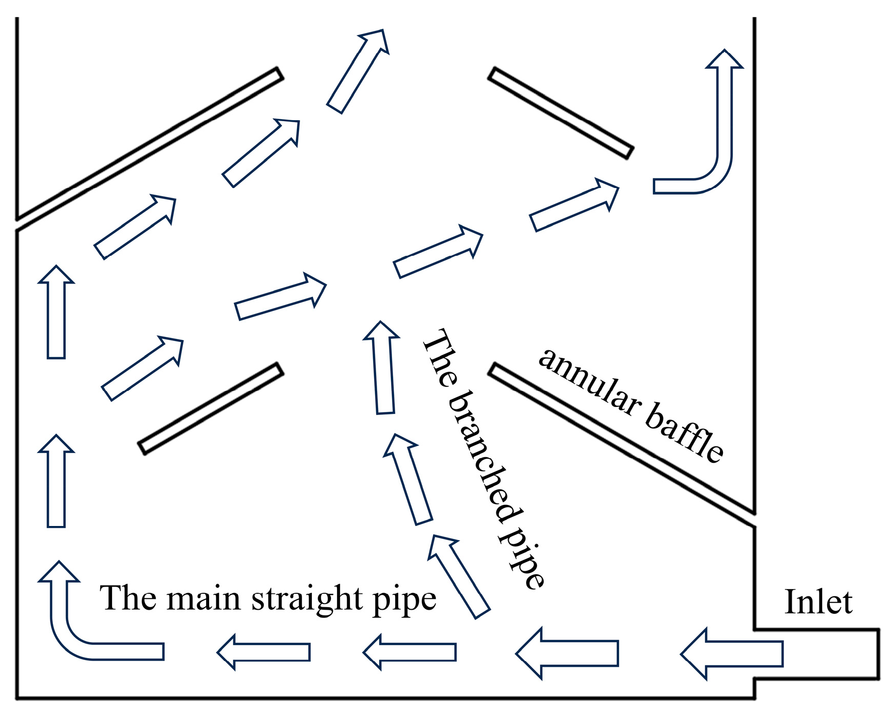 The novel TV-SPS preserves the inlet/outlet dimensions and overall chamber geometry of the conventional ST-SPS while integrating seven annular baffles within its main body. Each baffle is oriented at 60° relative to the vertical wall plane and incorporates 5 mm chamfers at the chamber–wall interfaces, thereby emulating the energy dissipation characteristics of Tesla valve counterflow channels (