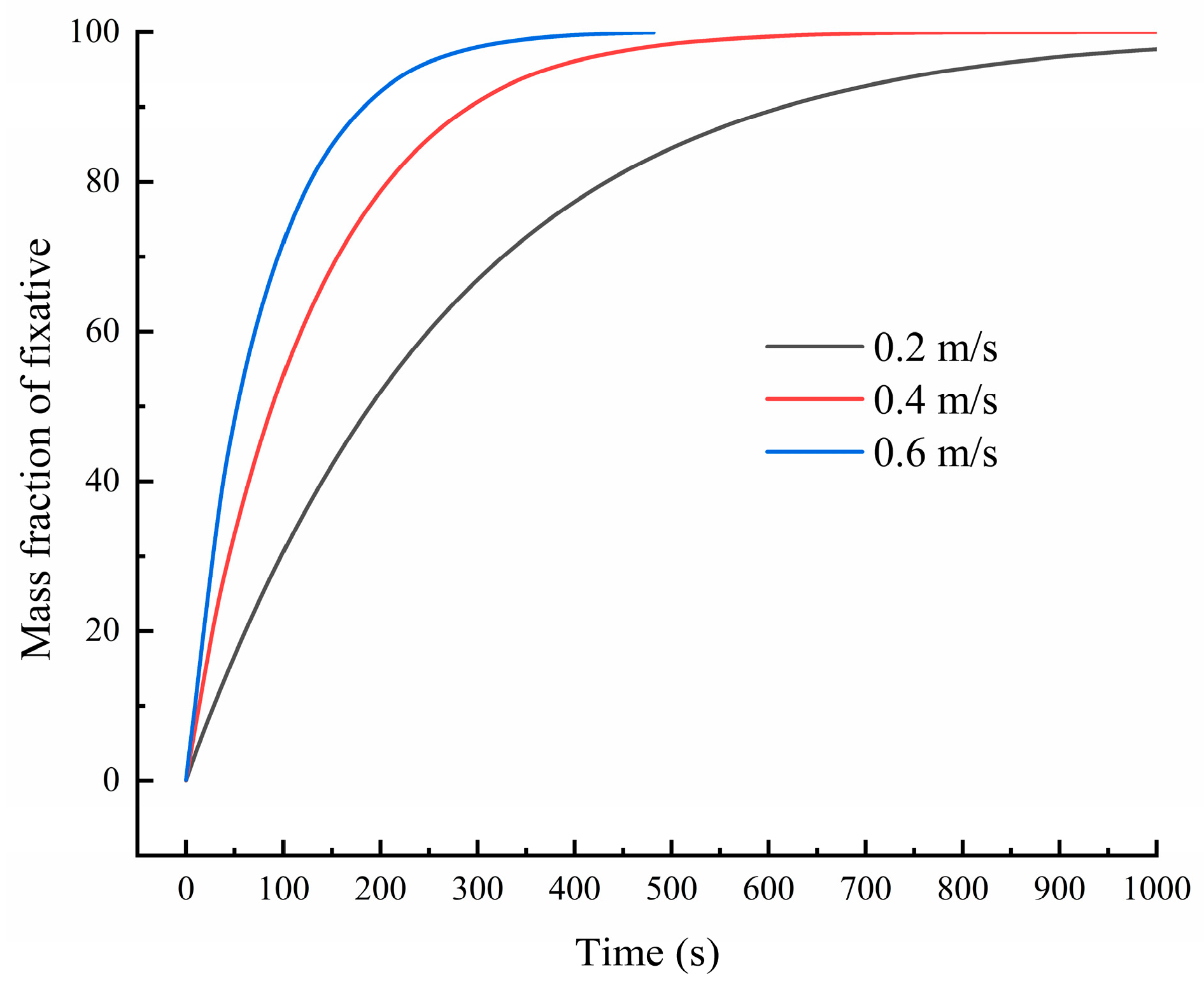 Figure 12. The higher the ratio of the fixative mass fraction, the more consumption of the fixative. The results indicate that the TV-SPS exhibits a pronounced advantage in fixative utilization efficiency; its fixative consumption is much smaller than that of the ST-SPS, with its consumption remaining relatively stable across varying inlet velocities. In contrast, the ST-SPS shows notable fluctuations in fixative consumption with changing inlet velocities, with the minimum consumption consistently observed at 0.4 m/s across all volume ratios.